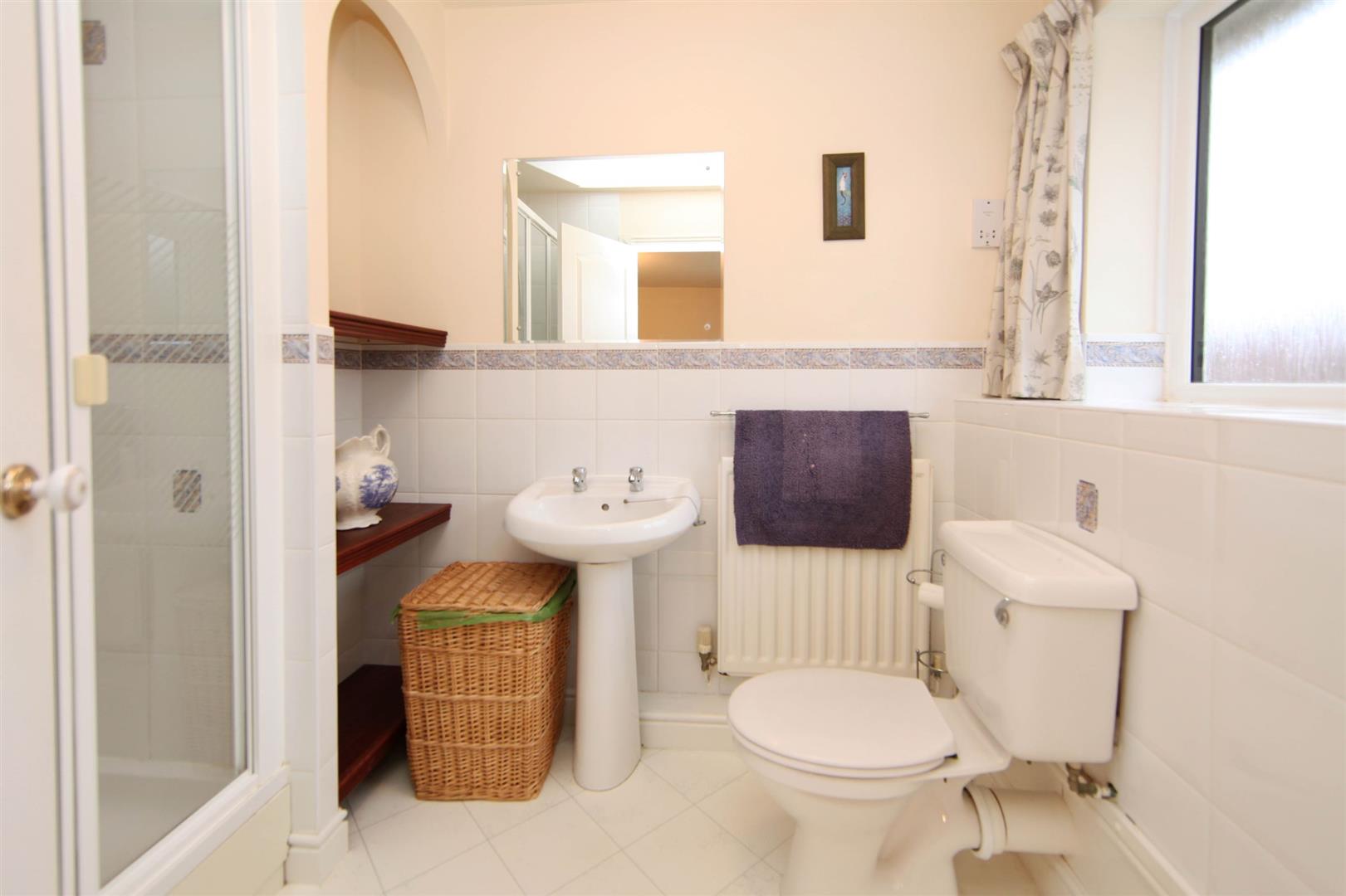 En-Suite Shower Room - 1 1/2 width tiled shower cubicle with Triton shower. Low level flush W.C. and pedestal wash hand basin. Half height wall tiling. Shelved alcove. Radiator and uPVC framed patterned double glazed window.