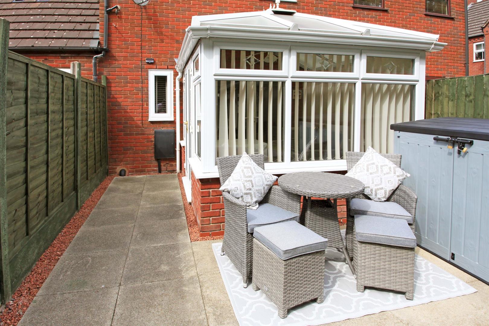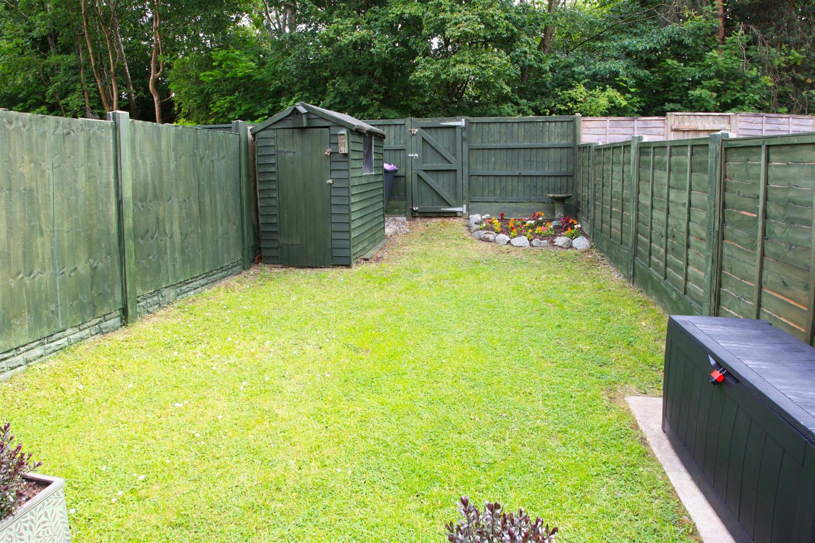 The enclosed rear garden has been landscaped and is neatly set out to slabbed patio and established lawn beyond. Timber garden shed. Gated rear access.