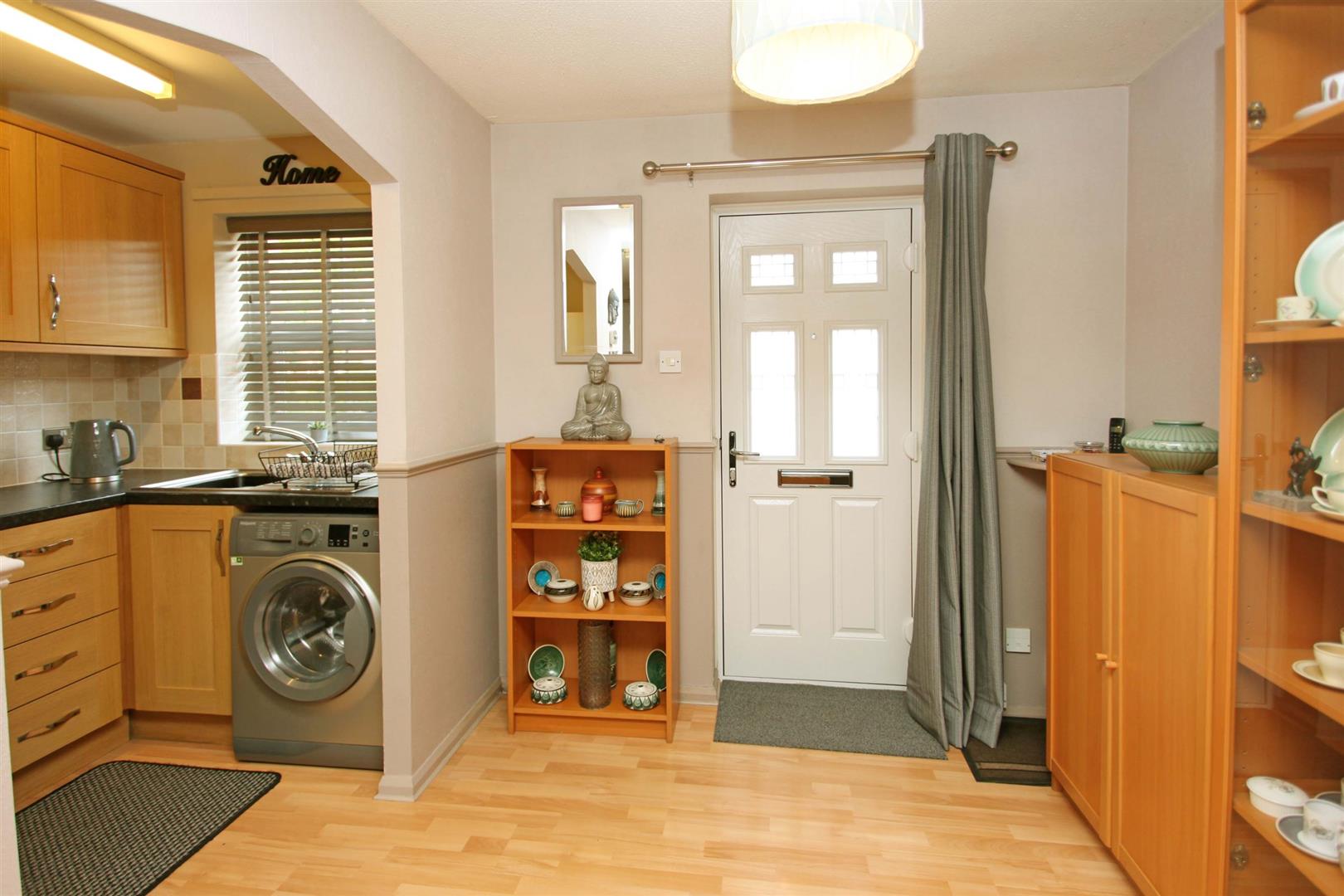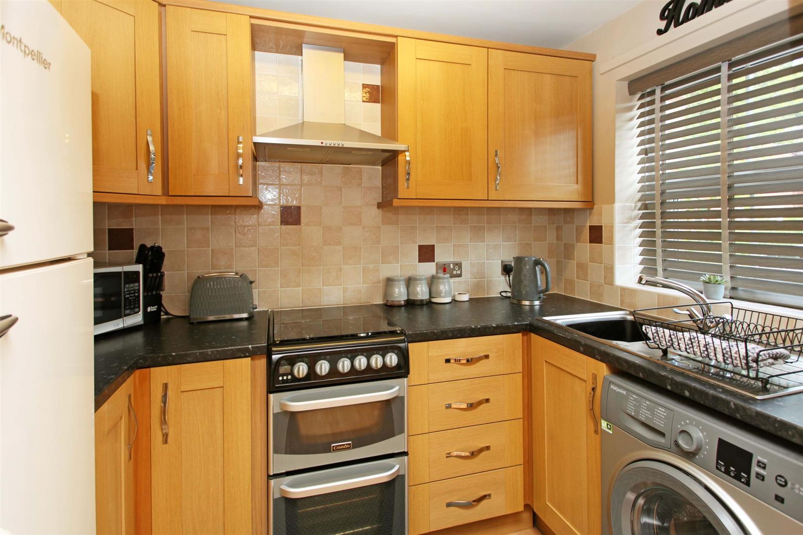 Kitchen - 2.60 x 1.60 (8'6" x 5'2") - modern fitted kitchen complrising a stainless steel sink unit with corner cupboard below. Recess to the side having plumbing connection for a washing machine. Return worksurface with drawer unit below. Space for electric or gas cooker with filter extractor hood above. Further half corner cupboard with roll edge worktop to finish. Recess for upright fridge freezer. Splash back wall tilling and laminate flooring. uPVC framed double glazed window with outlook to the front.