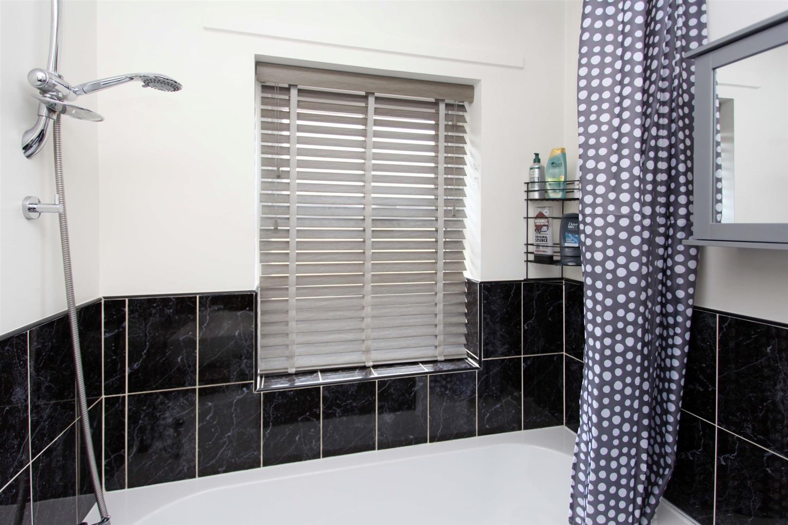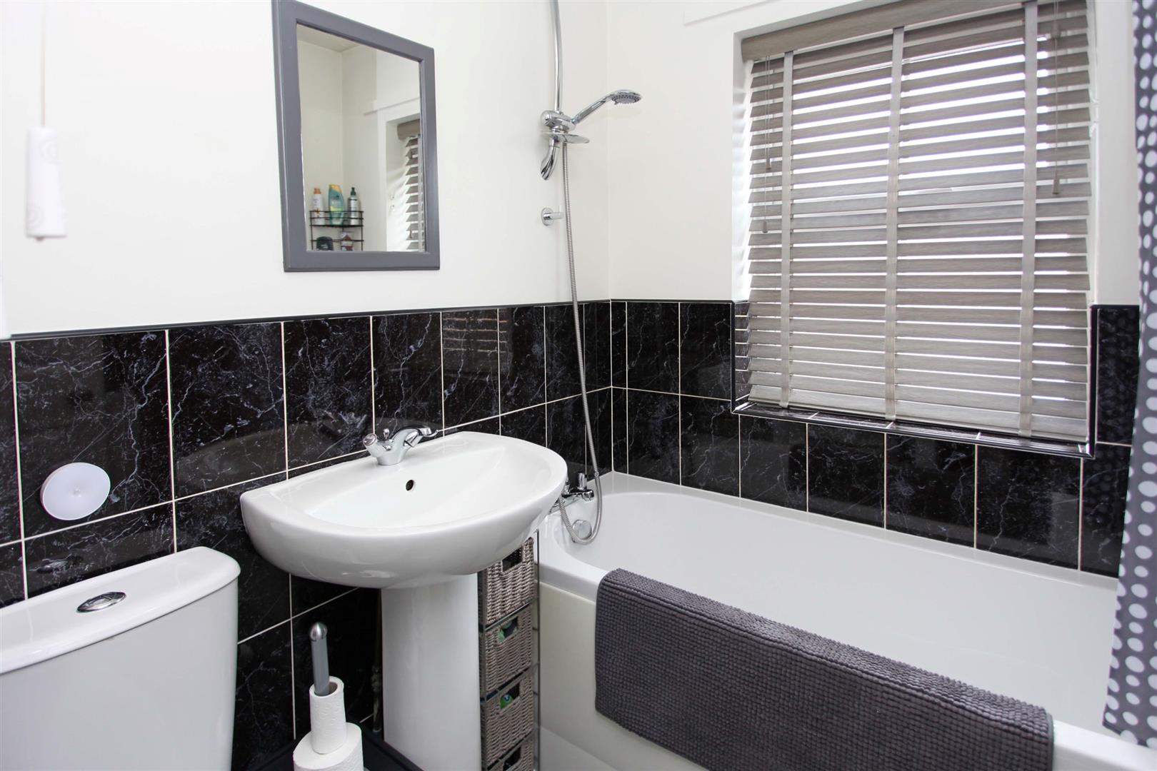 Bathroom - lovely modern white suite comprising panelled bath with chrome shower over off mixer tap. Pedestal wash hand basin. Low level flush W.C. Half height wall tiling. Radiator. uPVC framed patterned double glazed window.