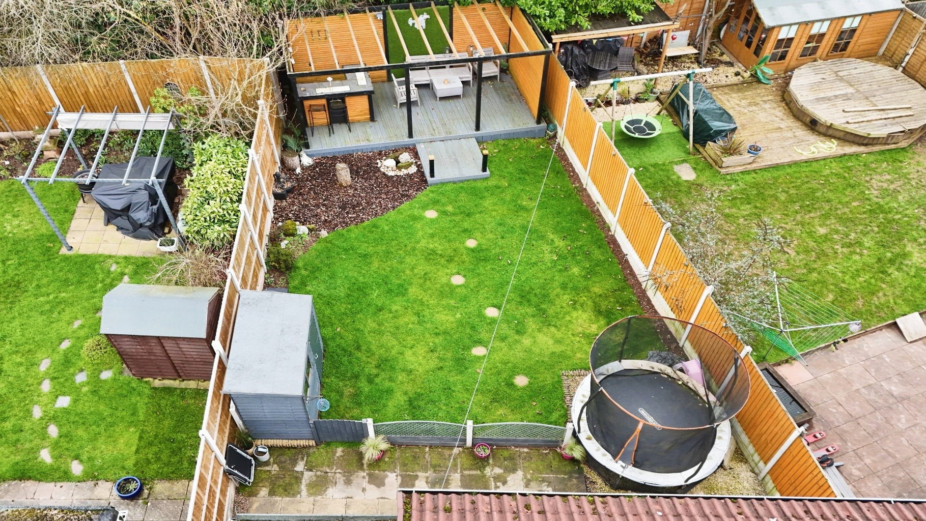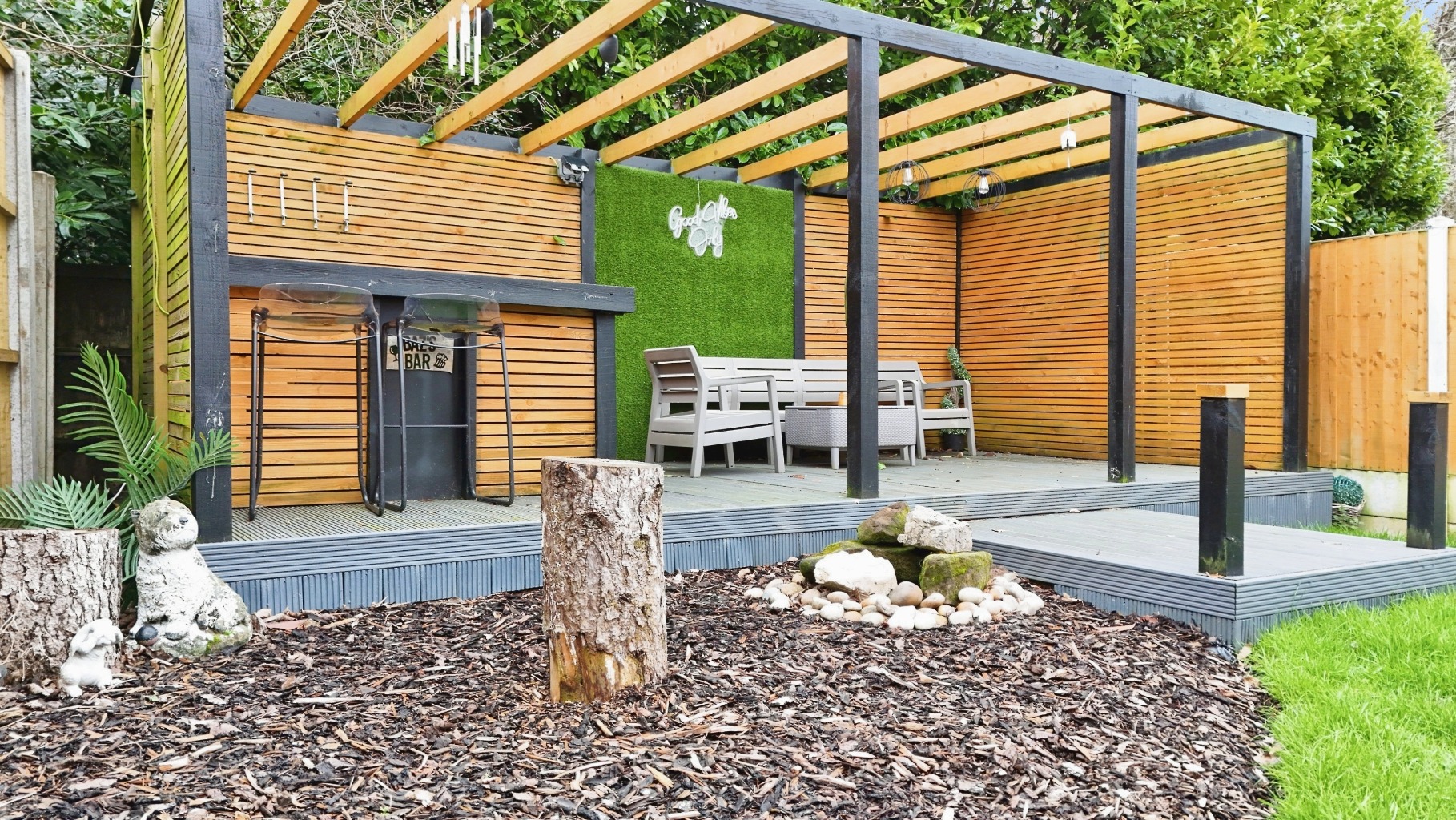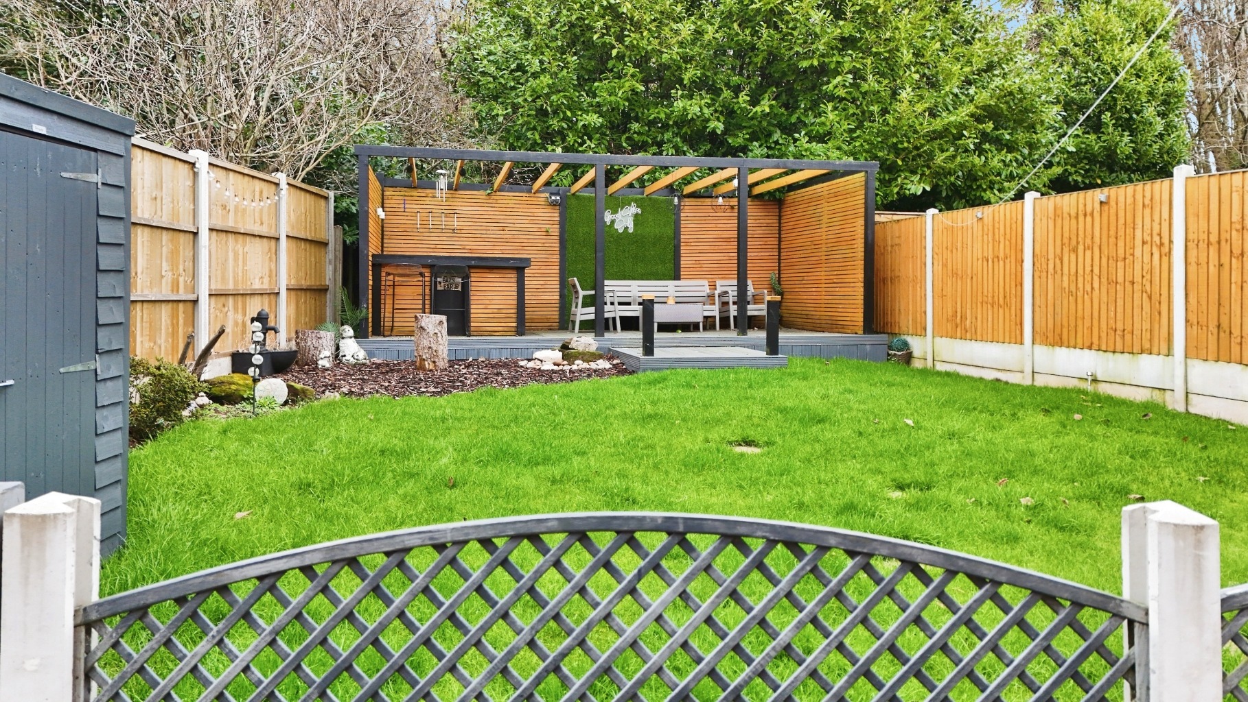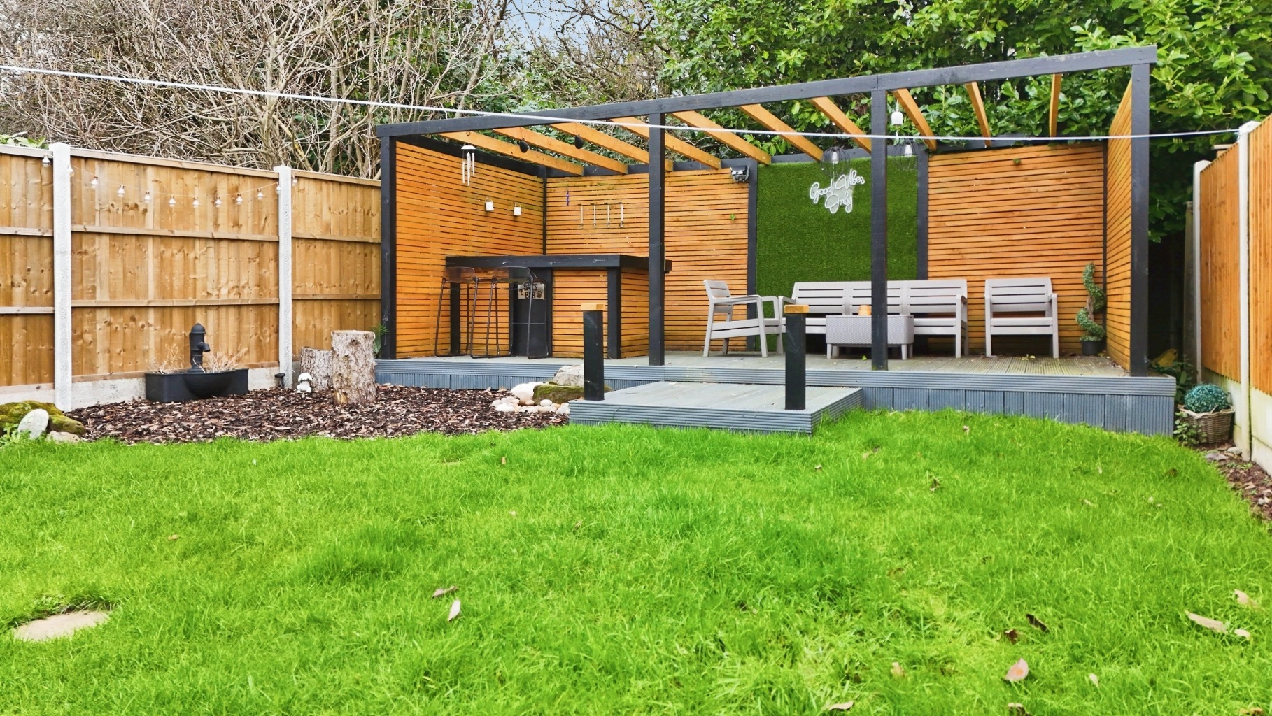 - Patioed / Lawned Gardens with Decked Bar & Seating Area