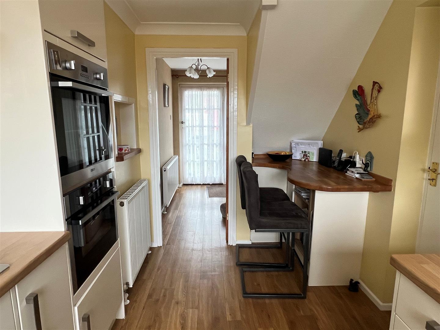 Kitchen - 3.63 x 2.44 (11'10" x 8'0") - Having base and wall mounted units comprising cupboards and drawers with wood effect work surfaces above. Composite 1 1/2 sink with drainer and mixer tap. Integrated oven, microwave and grill. 5 ring gas hob with extractor fan above. Breakfast bar. Rear aspect uPVC double glazed window and radiator. Door to...