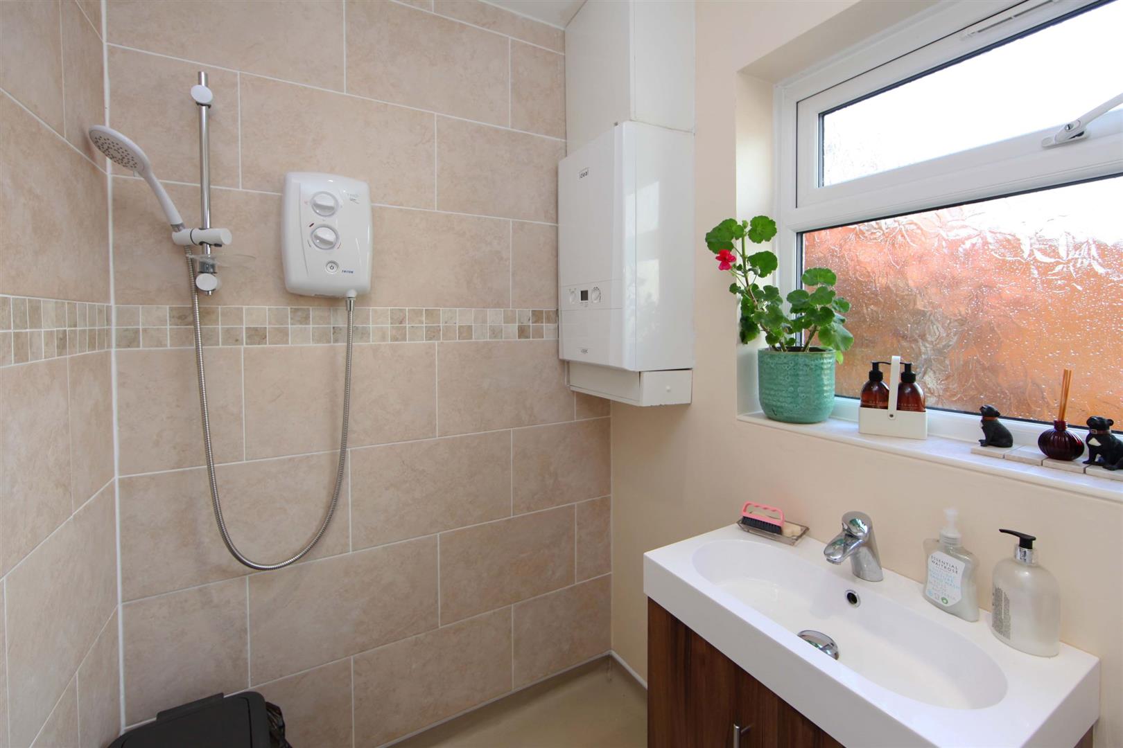 Wet Room - Being partially tiled with electric shower unit, wash basin with cupboard below and low-level flush WC. Rear aspect uPVC double glazed window and towel radiator.