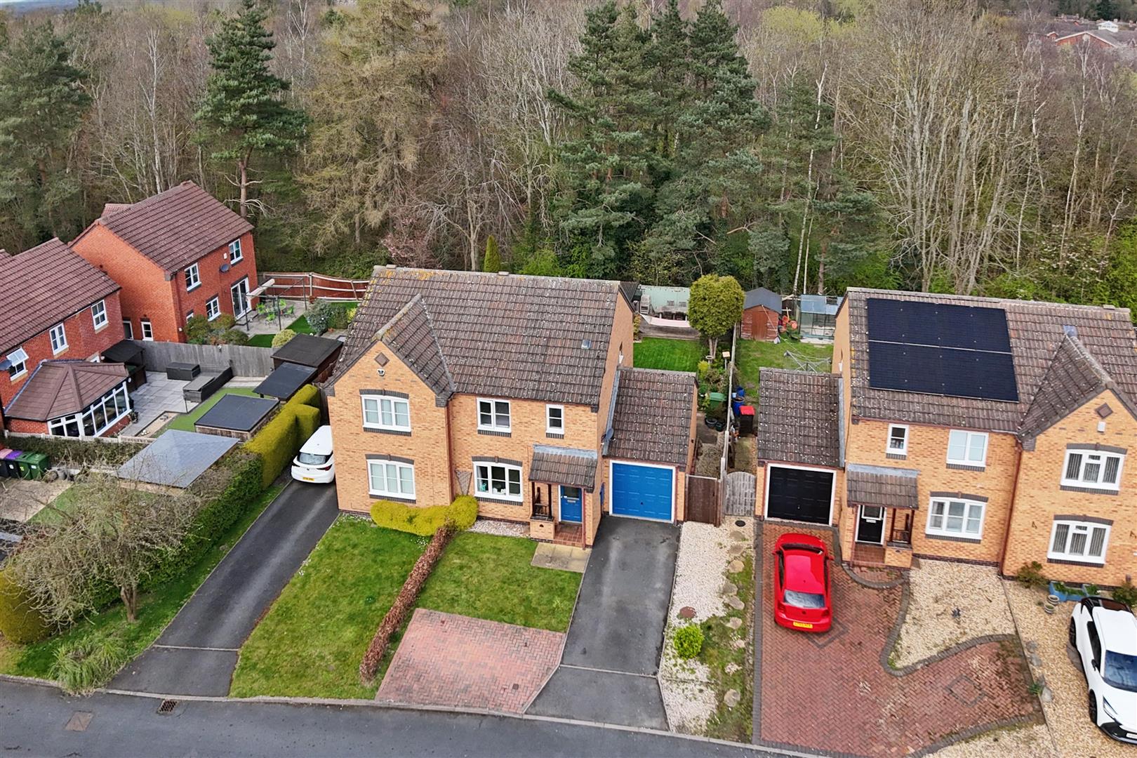 Parking is a breeze with space for up to three vehicles, complemented by a garage for additional storage or secure parking. The rear garden is a true highlight, featuring a serene woodland backdrop that creates a peaceful retreat for outdoor enjoyment.