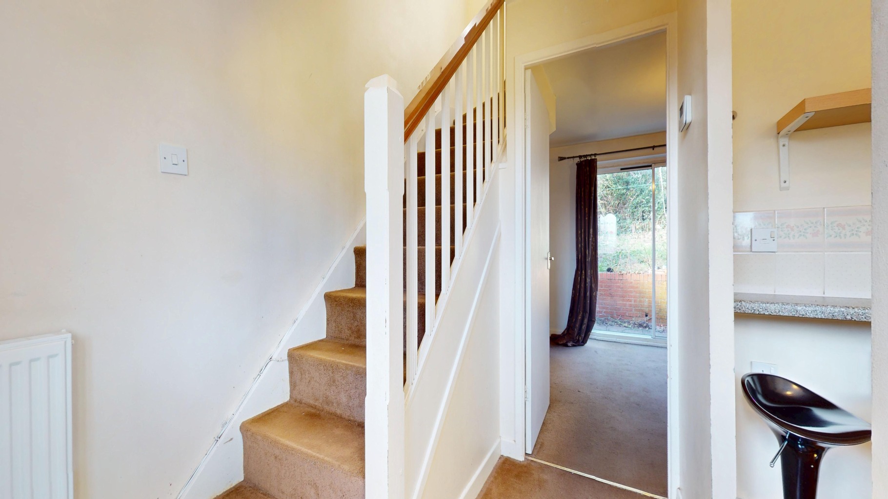 Upon entering, you are greeted by a functional kitchen positioned at the front of the property, offering a practical space for daily living. The heart of the home is the living room, located at the rear, which benefits from sliding doors that open directly onto the private garden. This seamless connection between indoor and outdoor spaces is perfect for relaxation and entertaining, allowing natural light to flood the room.