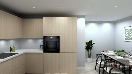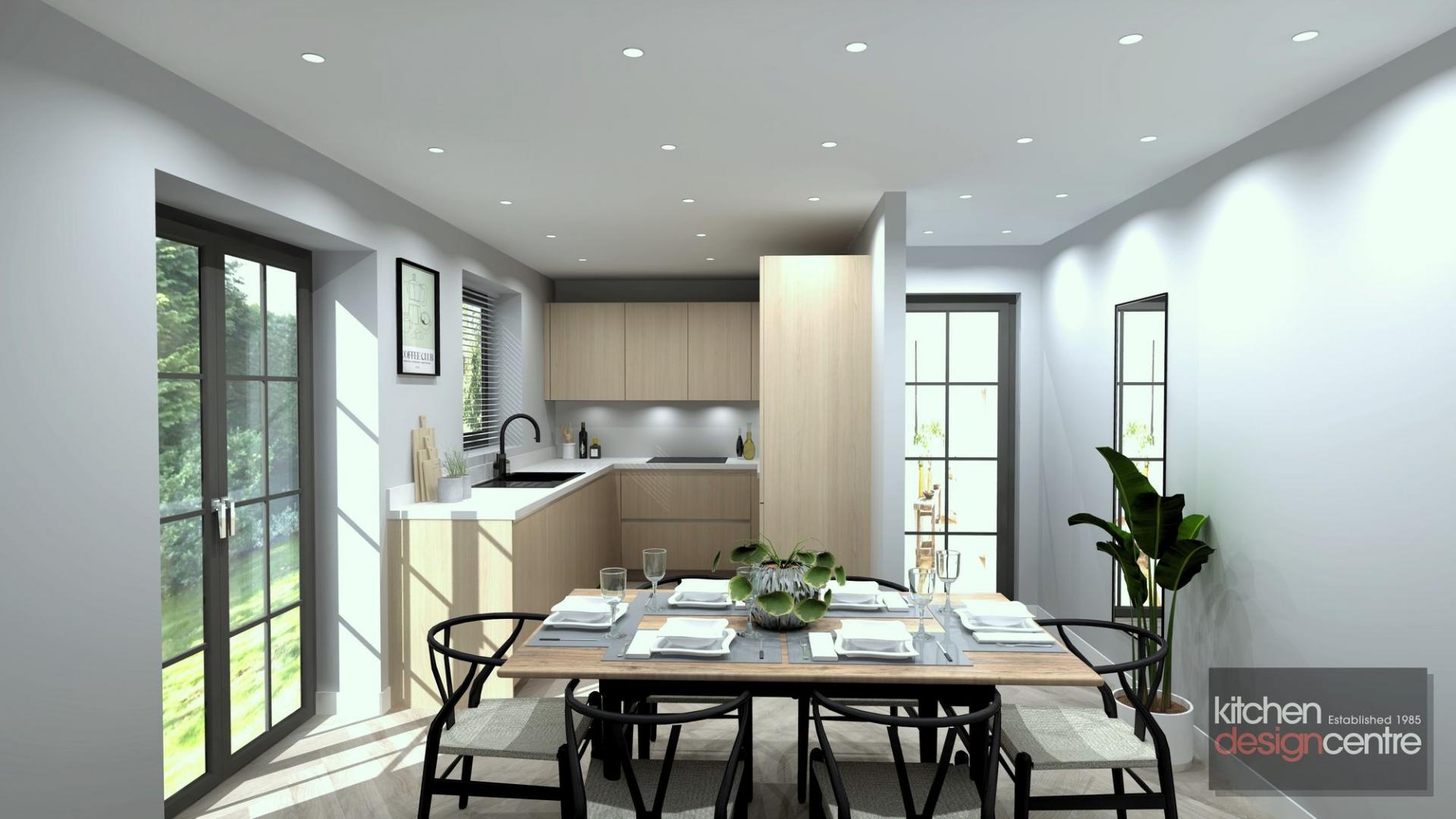 At the heart of the home lies a stunning contemporary kitchen designed by Häcker, complete with sleek handleless units and integrated appliances, opening into a bright dining area where French doors invite the outside in, ideal for everything from quiet mornings to relaxed entertaining.