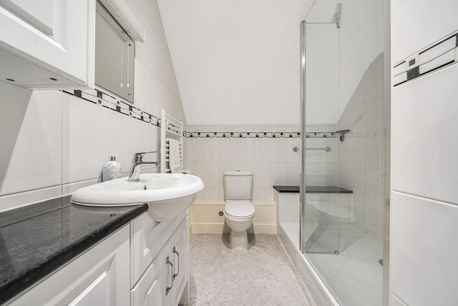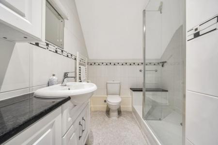 SHOWER ROOM: White suite comprising of a counter sunk wash hand basin with mixer tap and storage cupboards beneath, low level WC, large walk-in shower cubicle with glazed panel and plumbed in shower. Attractive wall tiling, vinyl flooring, radiator/towel rail, wall mounted mirror, shaver point and light.
