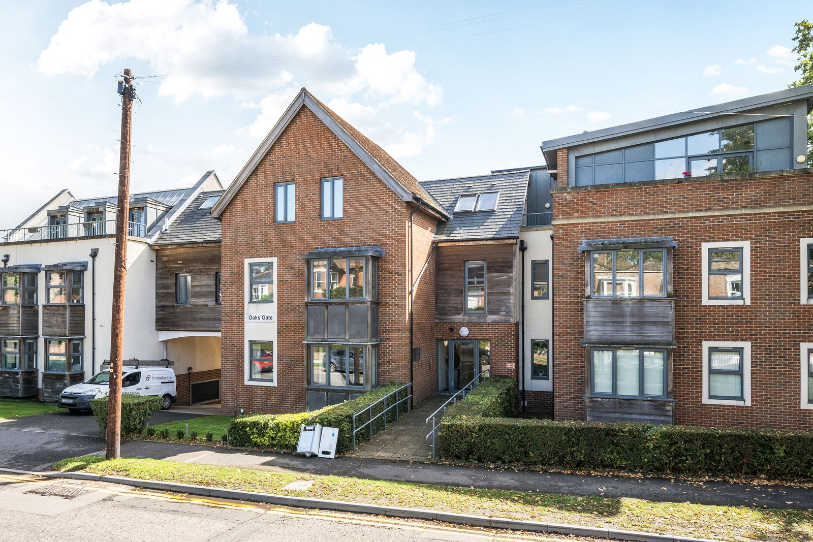 OUTSIDE: There are communal gardens and a driveway leads beneath a central opening down to the gated undercroft parking where there is an allocated single parking space for this apartment.