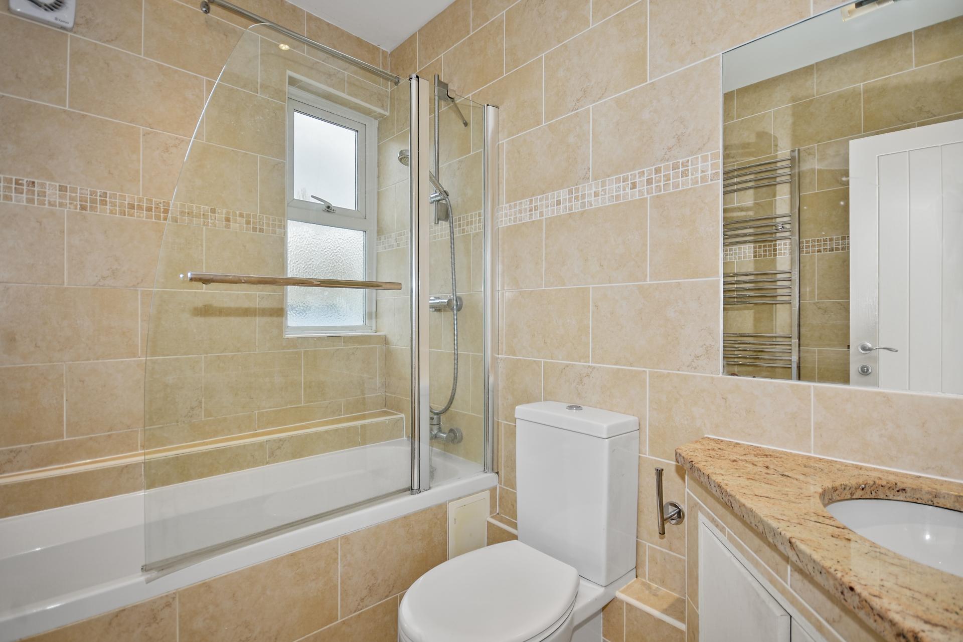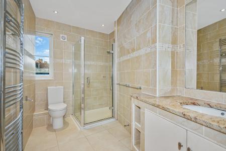 En-Suite Shower Room: Window to the rear. Fitted with white suite comprising WC, hand basin set onto storage unit and shower cubicle. Tiled walls.