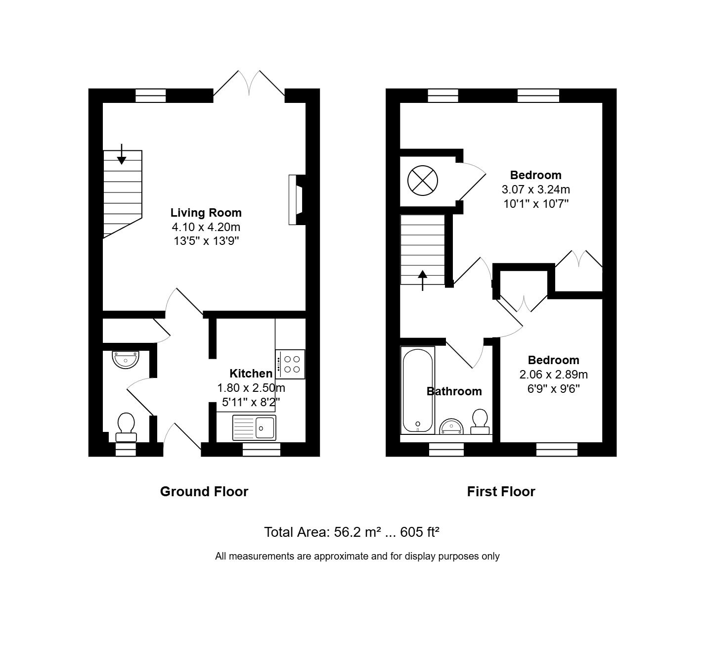 The accommodation extends to around 605 sq. ft. arranged over two floors and is very well-presented. The ground floor comprises a fitted kitchen to the front, downstairs WC, useful storage cupboard, and a light and airy living room with patio doors connecting to the sunny garden. There are two bedrooms upstairs both with built-in wardrobes, and a bathroom with shower over.