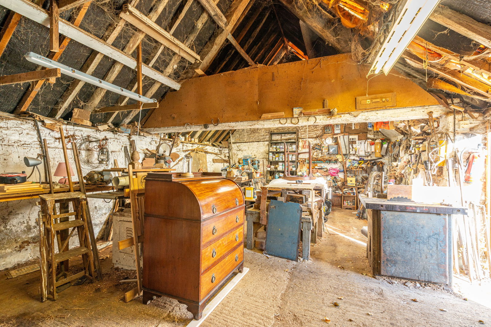 The Old Forge is a detached former farriers and blacksmith forge, a period single storey barn which has been used by the owner as a workshop for many years. A traditional barn, the building has a lot character with exposed A-frame beams and is mainly built with natural Cotswold stone with a more modern construction to the side.