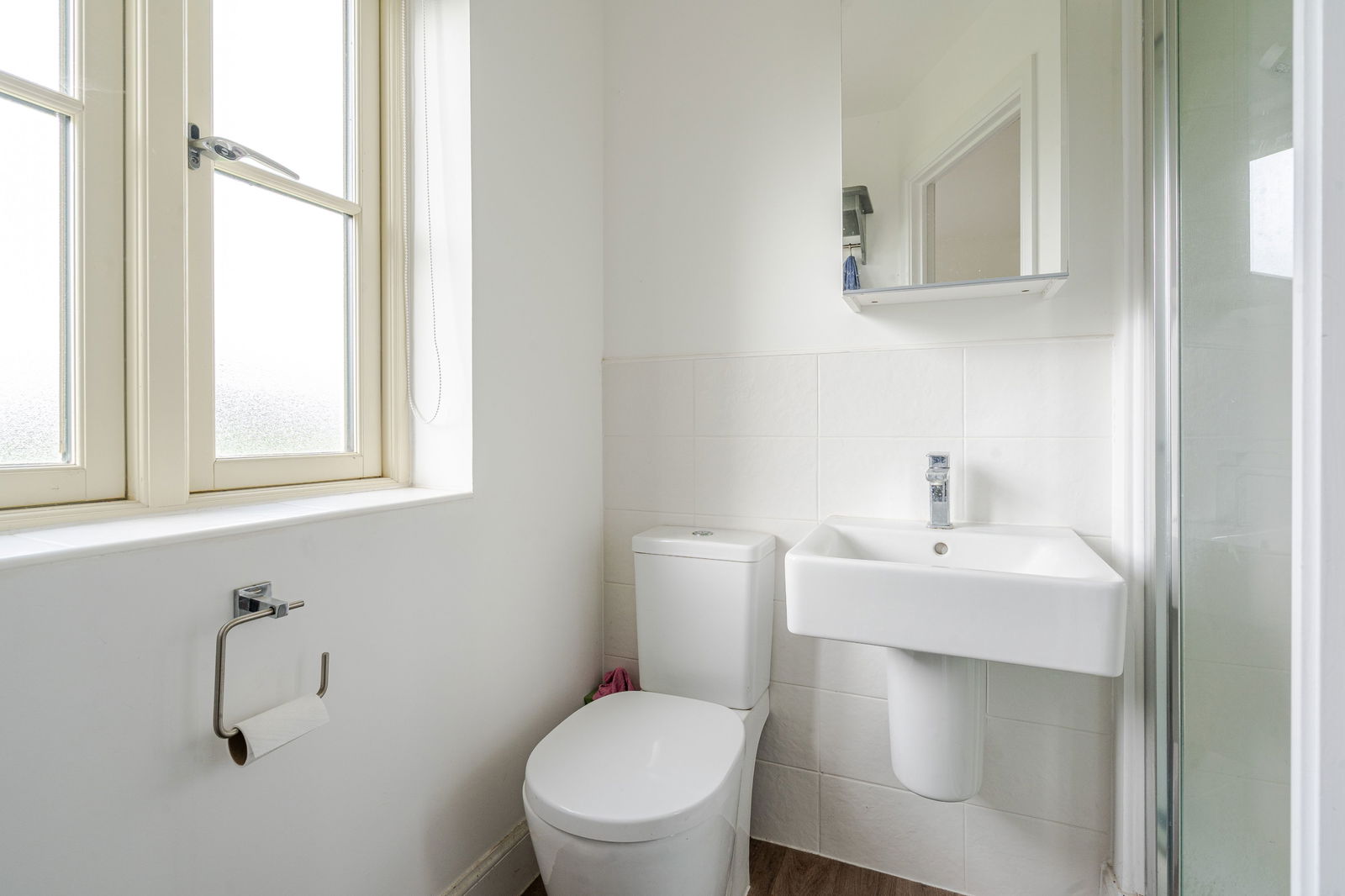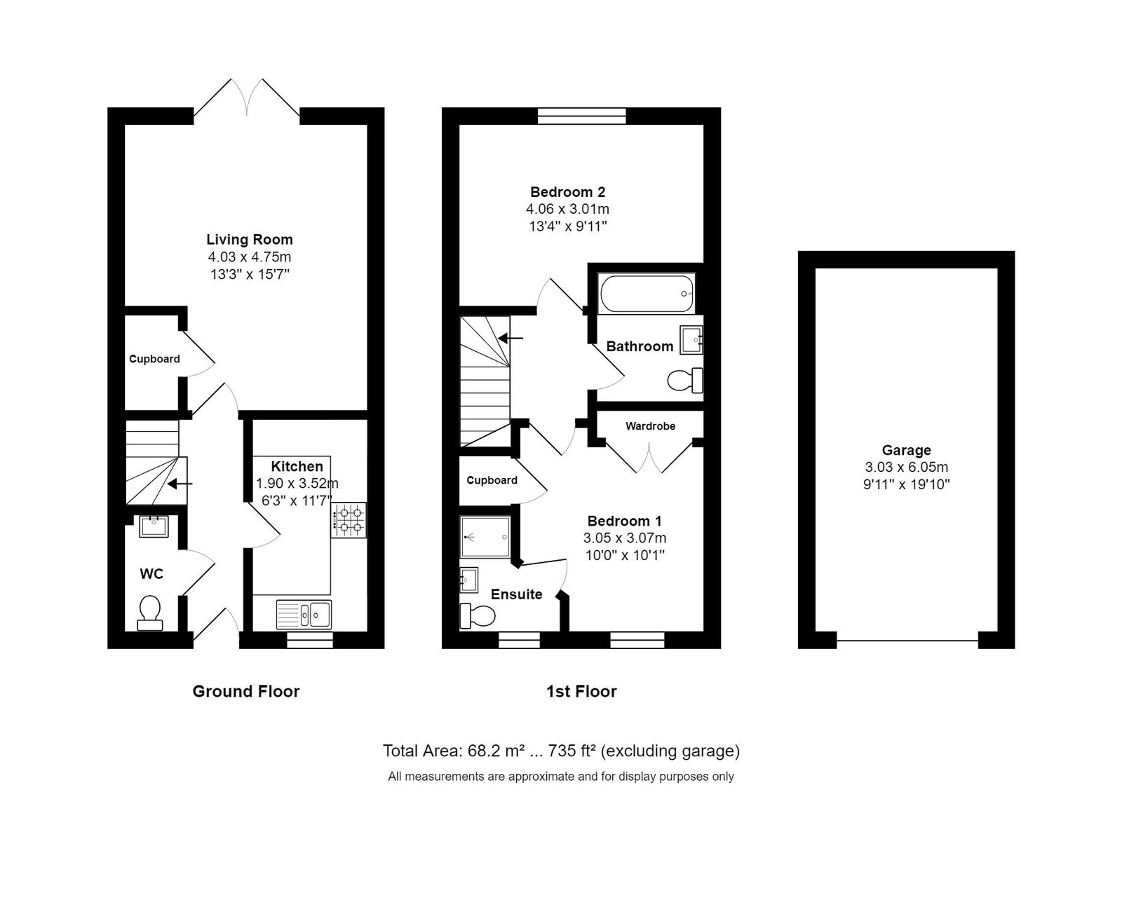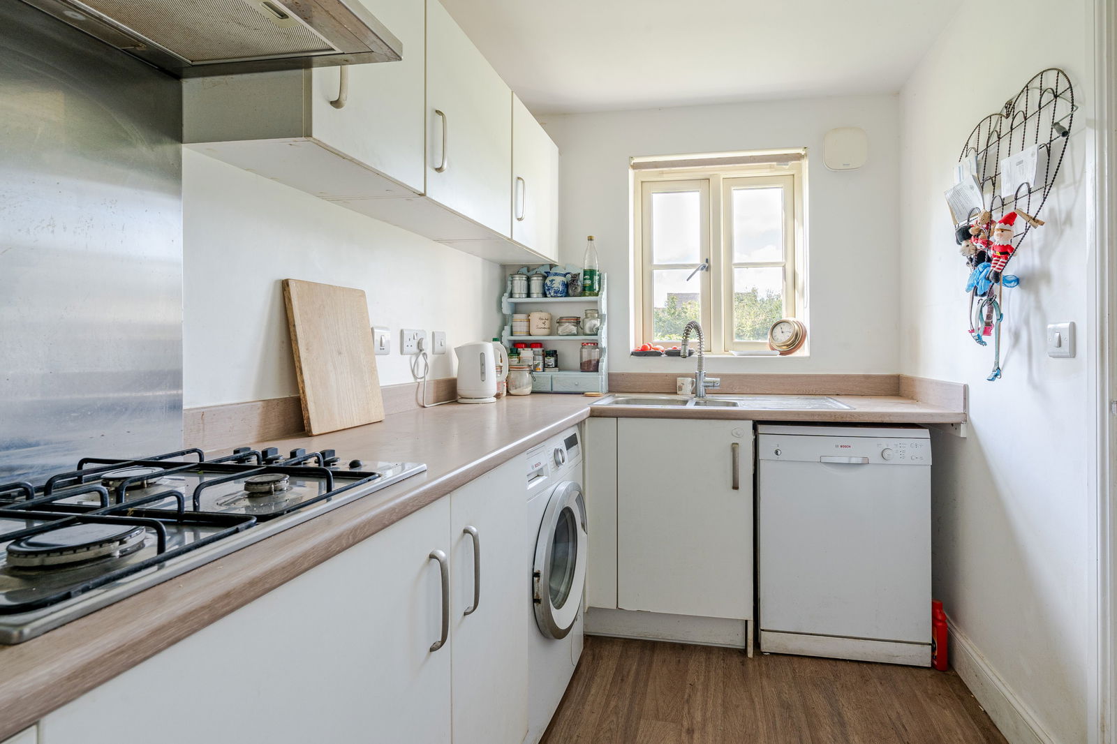 The accommodation is arranged over two floors and extends in all to 735 sq.ft. The ground floor comprises an entrance hall with WC off and a well-equipped fitted kitchen with built-in Zanussi appliances including a fridge/freezer, oven and gas hob. To the rear, there is a living/dining room with a large cupboard and double French doors opening to the garden. On the first floor, there are two double bedrooms and a family bathroom. The principal bedroom has an en-suite shower room, built-in wardrobes and enjoys lovely views over the green.