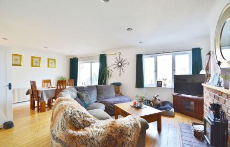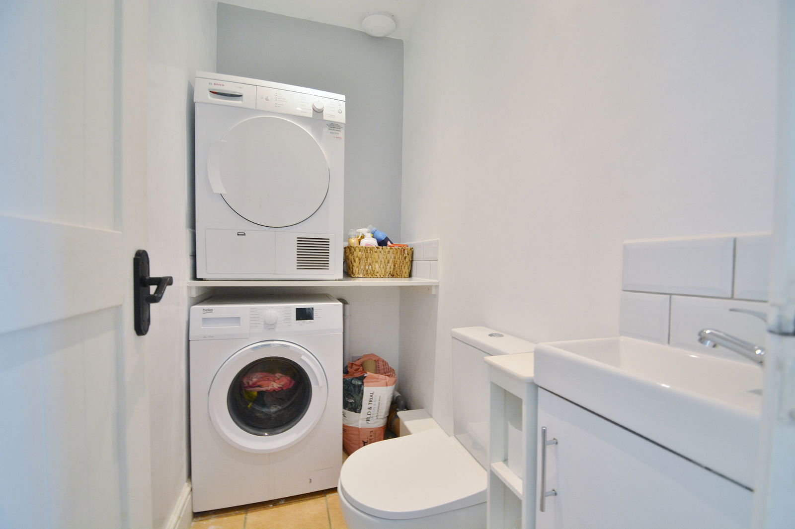 The property features a generous 22ft sitting/dining room with exposed floorboards and a wood-burning stove, perfect for cosy evenings. A conservatory opens onto the tiered rear garden, while a downstairs cloakroom—with space for a utility area and shelving for a washing machine and tumble dryer—adds convenience.