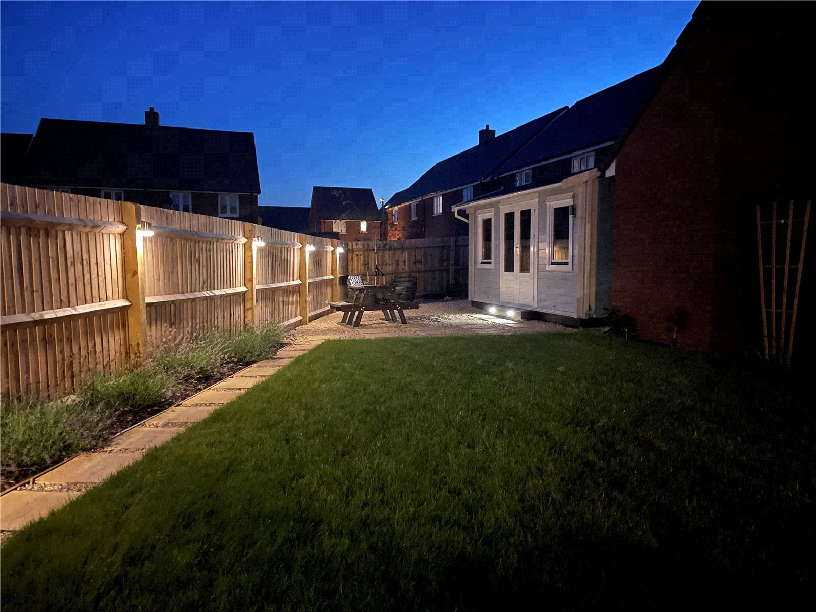 The rear garden at 14 Pamington Lane has been thoughtfully landscaped and improved by the current owners and benefits from a sunny south-west orientation. A paved terrace, directly accessible from the house via French doors, provides the perfect spot for al fresco dining. The neatly manicured lawn is bordered by well-planted beds, with climbing roses and mature shrubs. A pathway leads to a detached outbuilding offering excellent potential for a variety of uses, such as a home office, studio, or workshop. To the rear corner of the garden, a shingled seating area offers a second outdoor entertaining space and also space for a vegetable patch. The garden is fully enclosed by fencing and brick walling, offering both privacy and security, with gated access to the front. There is also a driveway providing parking for two vehicles in addition to a garage with storage above.