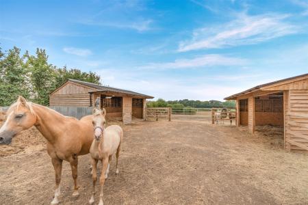 From the parking area at the front of the property, a five bar gated access leads to a driveway and turning area for equestrian / farm vehicles, with the current set up briefly comprising two 12' x 12' stables on skids, a 16' x 12' stable with adjoining tack room, all with power, lighting and water, two large open barn / stables and hay store area, gated access to inner yard with two further stables / field shelters. Gated access provides access into the main paddock. The land is currently split into one main paddock and a smaller secondary paddock.