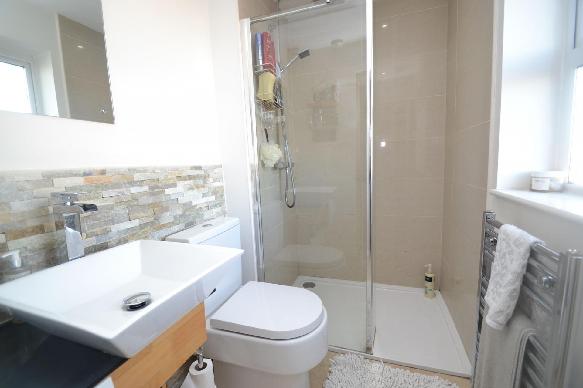 En-Suite: Walk in shower cubicle with a glass screen and chrome thermostatically controlled shower unit, wash basin set on a contemporary vanity unit, wc in white, heated chrome towel rail, frosted Upvc dg window, extractor, automatic ceiling lights.