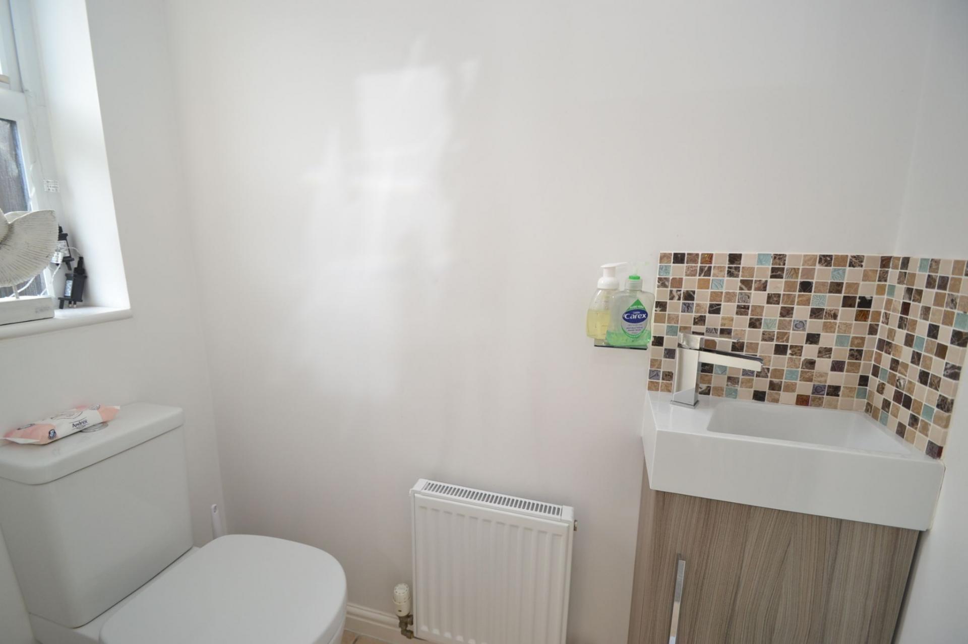 Cloaks: Corner wash basin set on a vanity unit, wc, frosted Upvc dg window, radiator, tiled floor.
