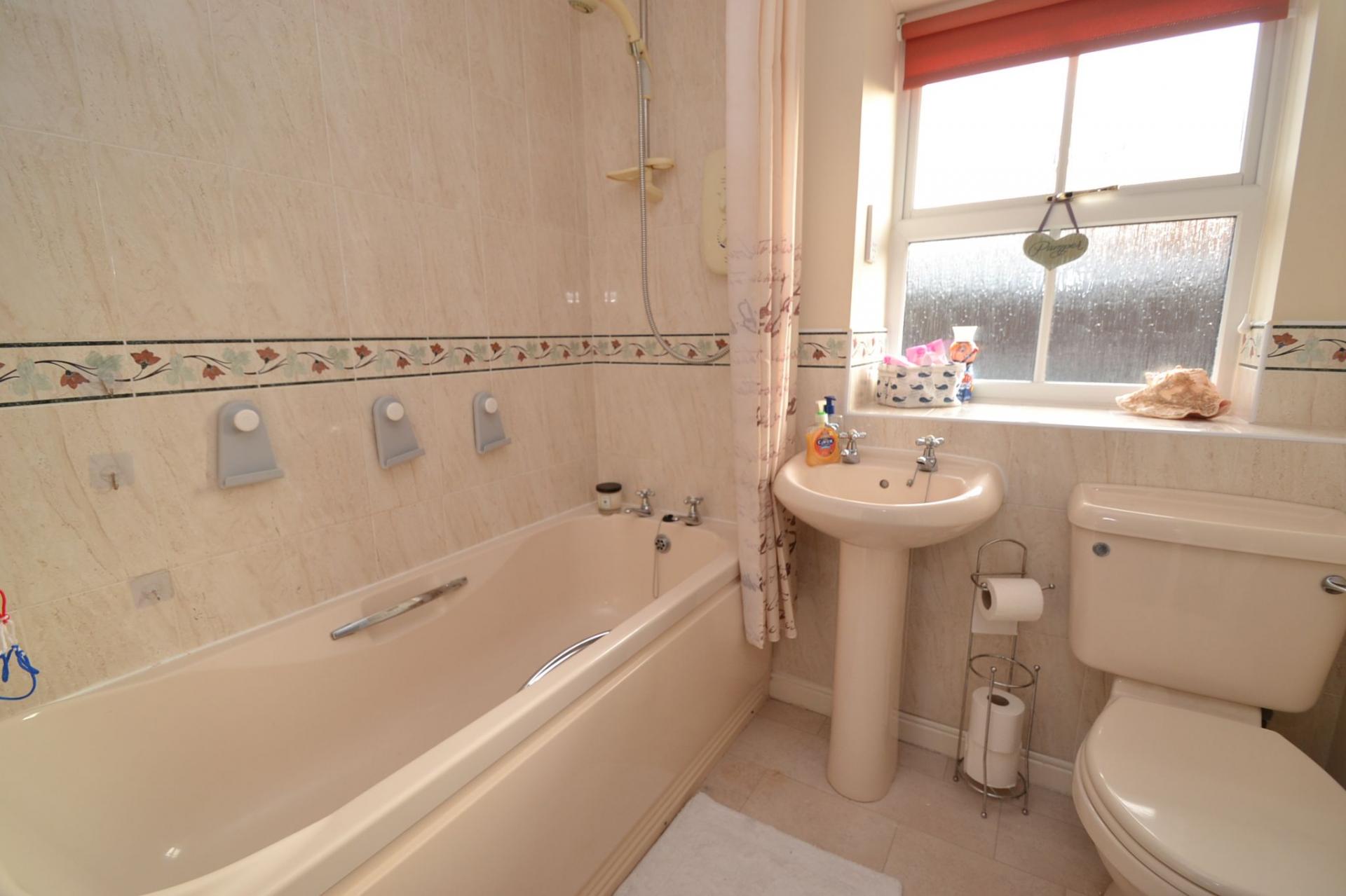 Bathroom: 1.9m x 1.9m (6'3 x 6'3). Three piece suite, tiling, Mira Sport electric shower over the bath with rail & curtain, extractor, frosted Upvc dg window, radiator.