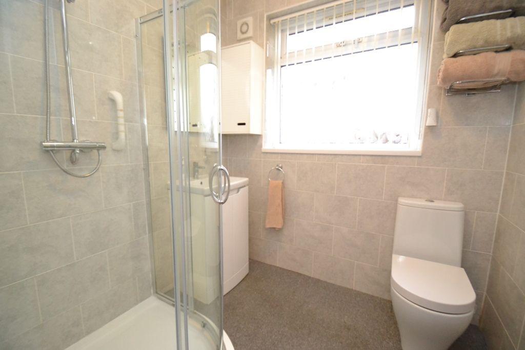 Shower Room: 2.00m x 1.85m (6'6 x 6'0). Wrap around shower cubicle with a chrome thermostatically controlled unit and double shower heads, fully tiled, wash basin set on a vanity unit, wc, heated chrome towel rail, frosted side Upvc dg window, extractor, touch light vanity mirror, vanity cupboard.