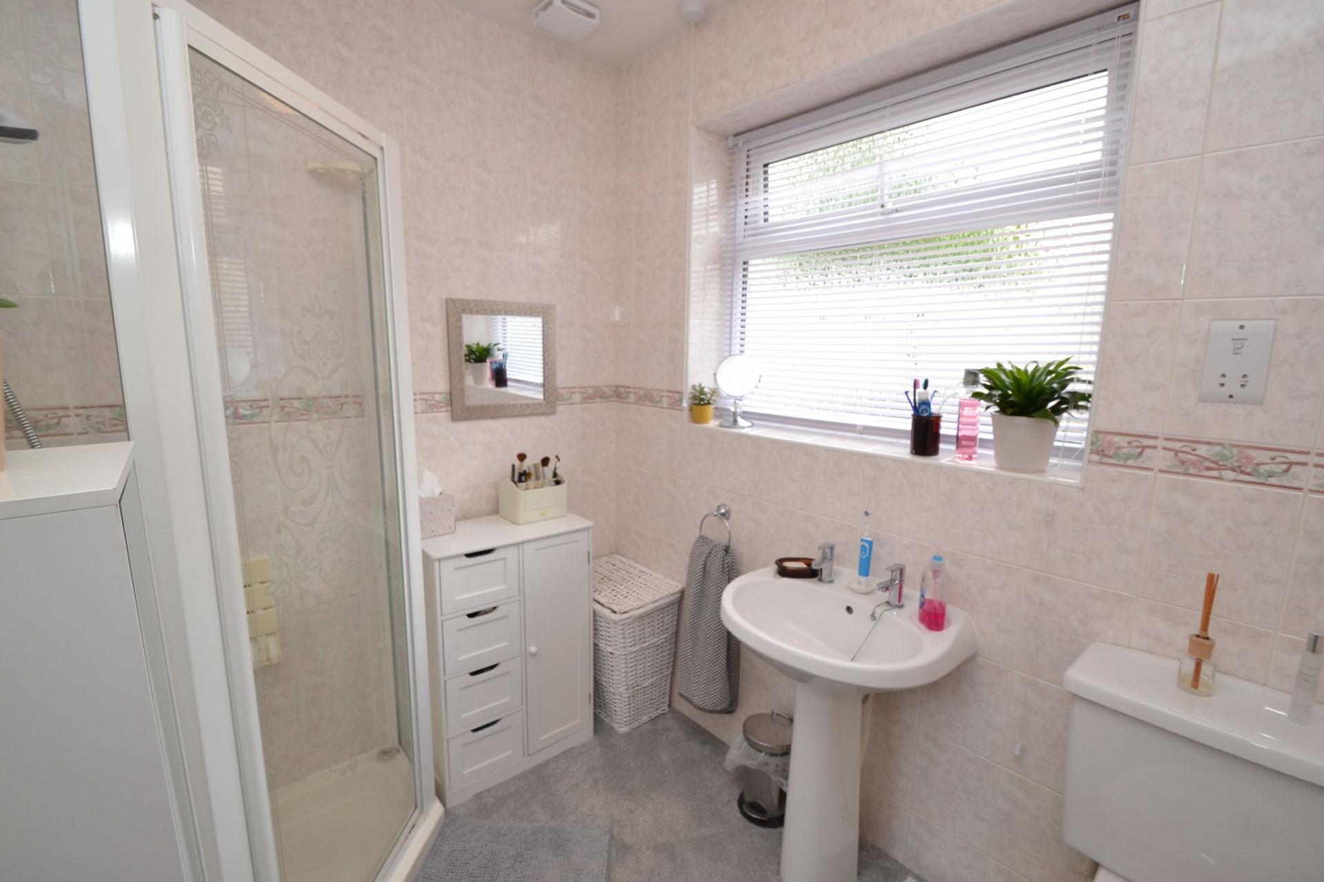 Shower Room: 2.24m x 1.81m (7'4 x 5'11). Fully tiled shower cubicle with an electric Mira Advance shower unit, wash basin and wc in white, fully tiled, frosted Upvc dg window, radiator.