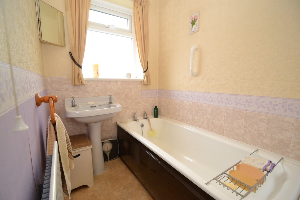Bathroom: 2.31m x 1.43m (7'6 x 4'8). Two piece suite in white with cast iron bath, chrome fittings, frosted Upvc dg window, splash back tiling, ch radiator, airing cupboard with cylinder tank.