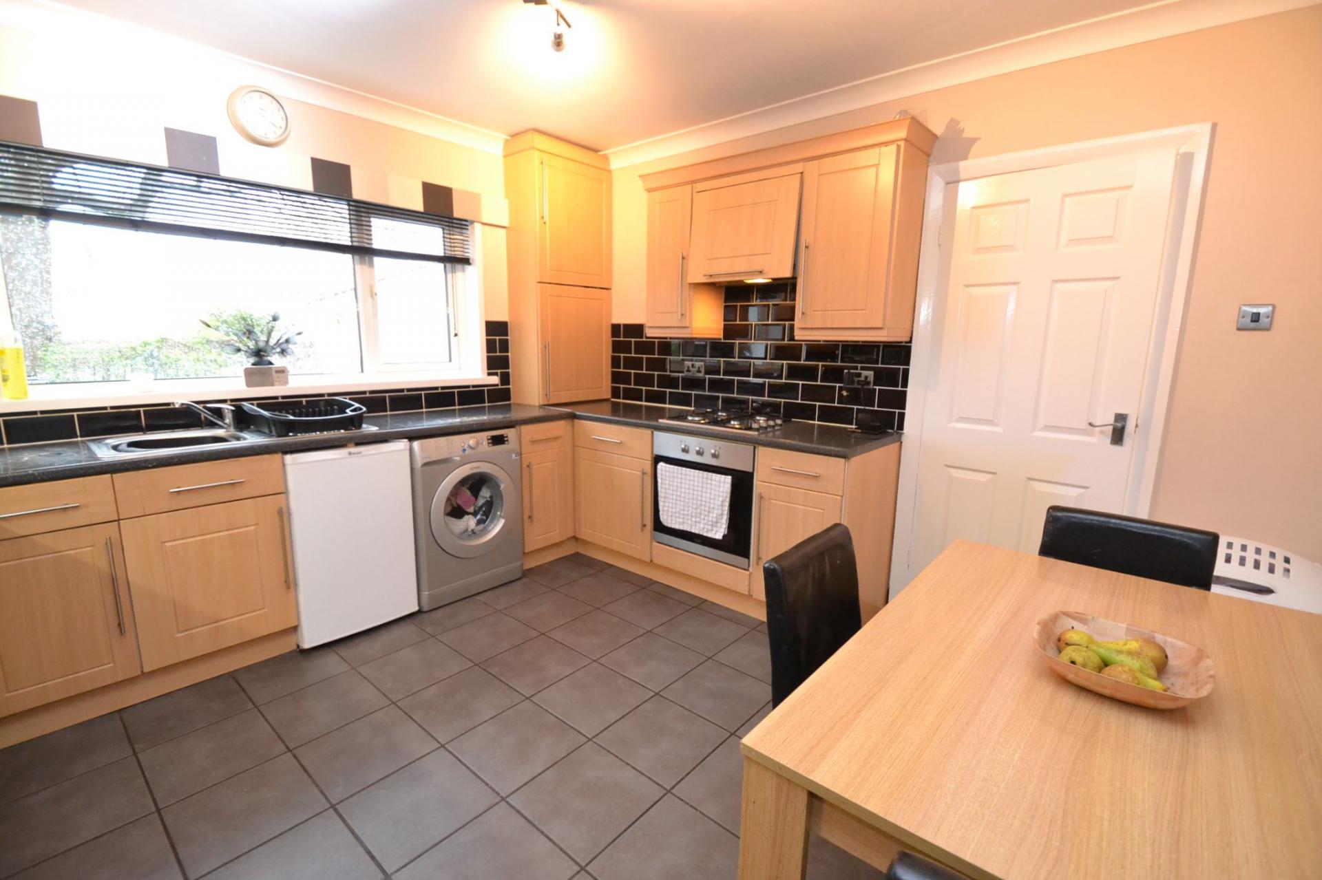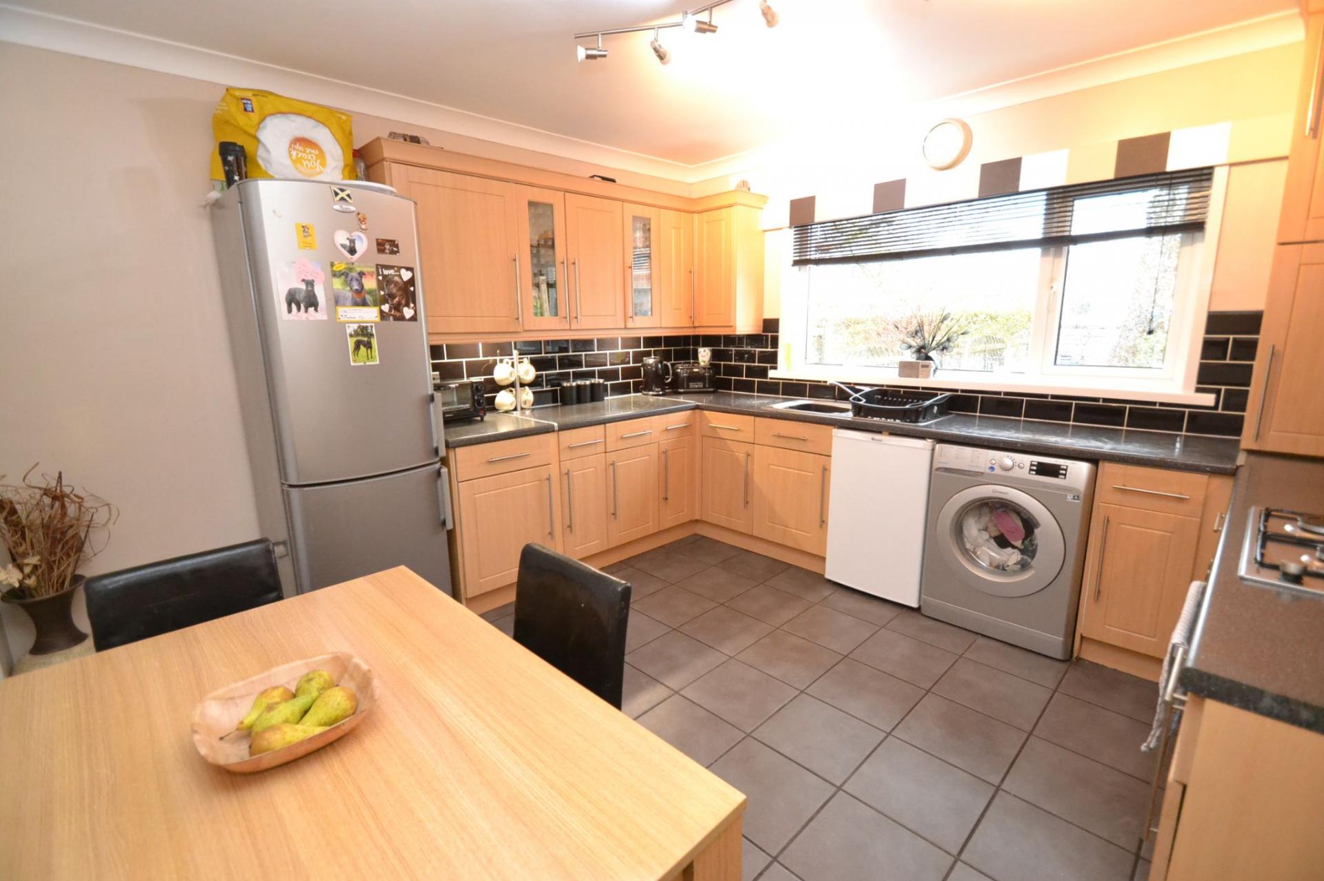 Kitchen Dining Room: Range of wall & base units in beech with stainless steel bar handles, work tops with black tiling in brick effect, extractor and light over a 4 ring gas hob and built in electric oven all in stainless steel, wall unit with the Ideal Logic Combi 30 condensing boiler, stainless steel sink with a mixer tap, space for a tall boy fridge freezer, plumbed for an auto-washer, space for a freezer, Upvc dg window to rear with fitted blind, slate tiled floor, radiator, space for a good size table and chairs, under stairs useful storage cupboard.