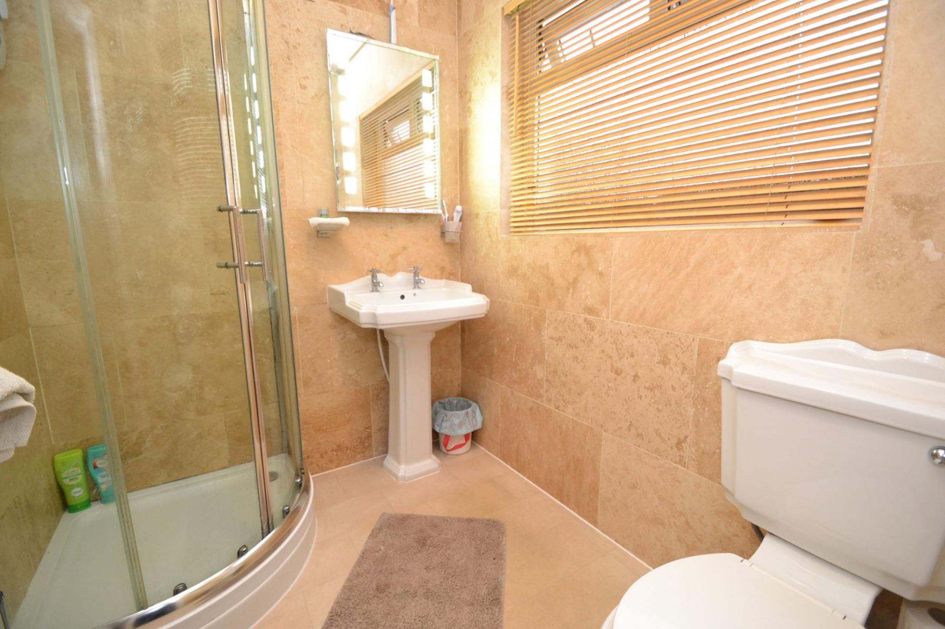 Shower Room: Wrap around shower cubicle with a Triton electric shower unit, wash basin and wc in white, fully tiled in stone effect, frosted Upvc dg window, Upvc cladded ceiling, extractor, radiator.