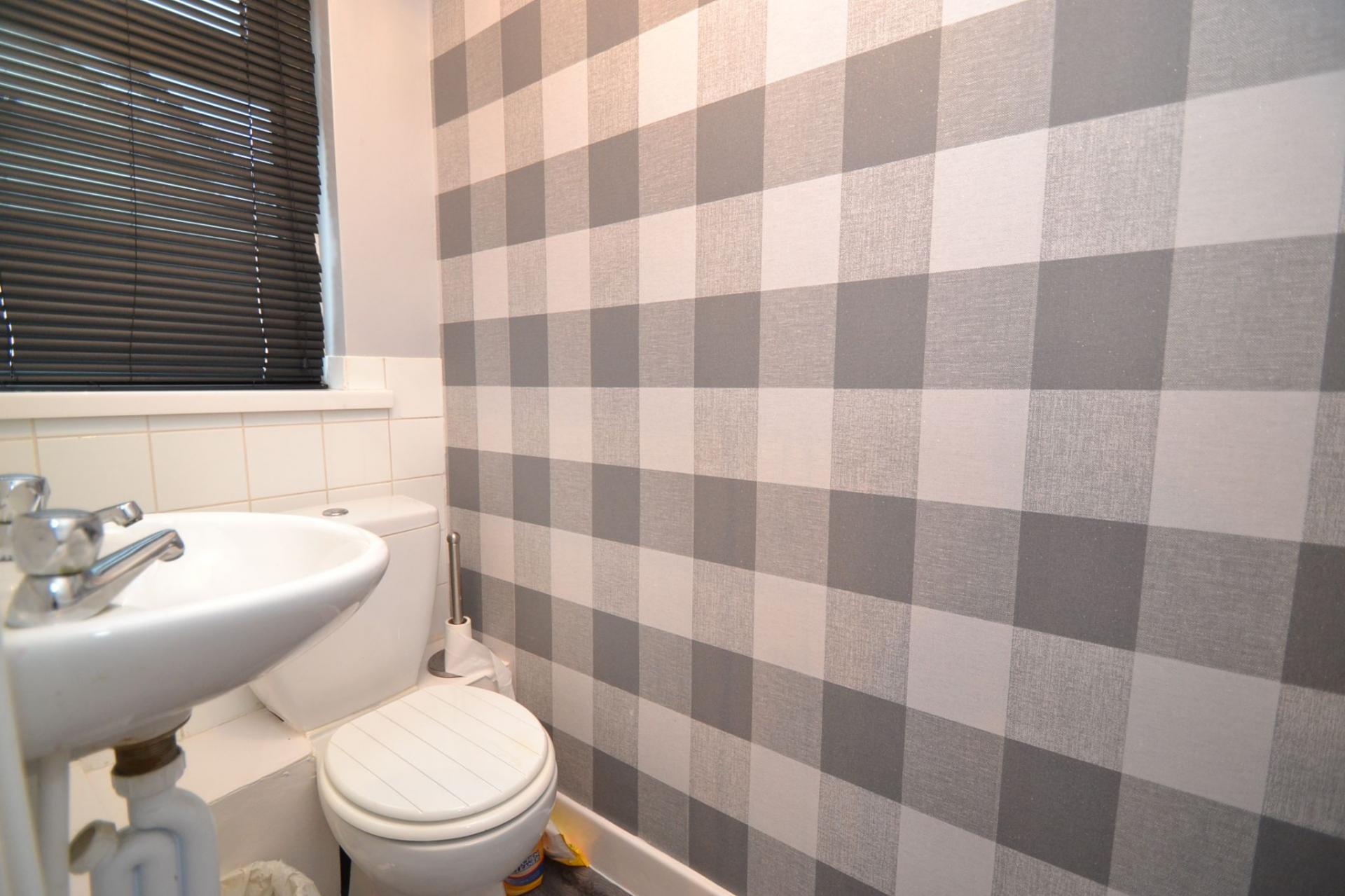 En-Suite: Cloaks with wash basin and wc in white, Upvc dg window, cupboard storage.