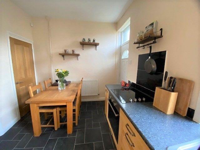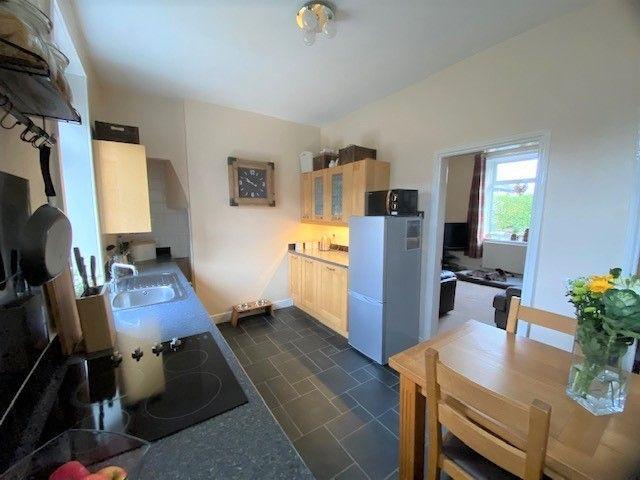 Kitchen Dining Room: Range of wall & base units in beech, work tops with matching splash backs and part tiled, Belling 4 ring halogen hob, built in stainless steel electric cooker, plumbed for an auto-washer, stainless steel sink with a mixer tap, space for a tall boy fridge freezer, rear composite door, Upvc dg window to rear, space for a dining table and chairs, internal door down to a cellar.