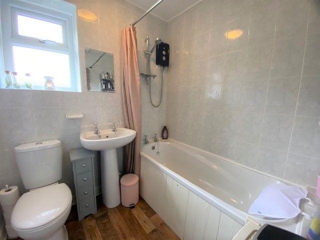 Bathroom: Three piece suite in white, fully tiled, electric shower over the bath with rail & curtain, radiator, frosted Upvc dg window.