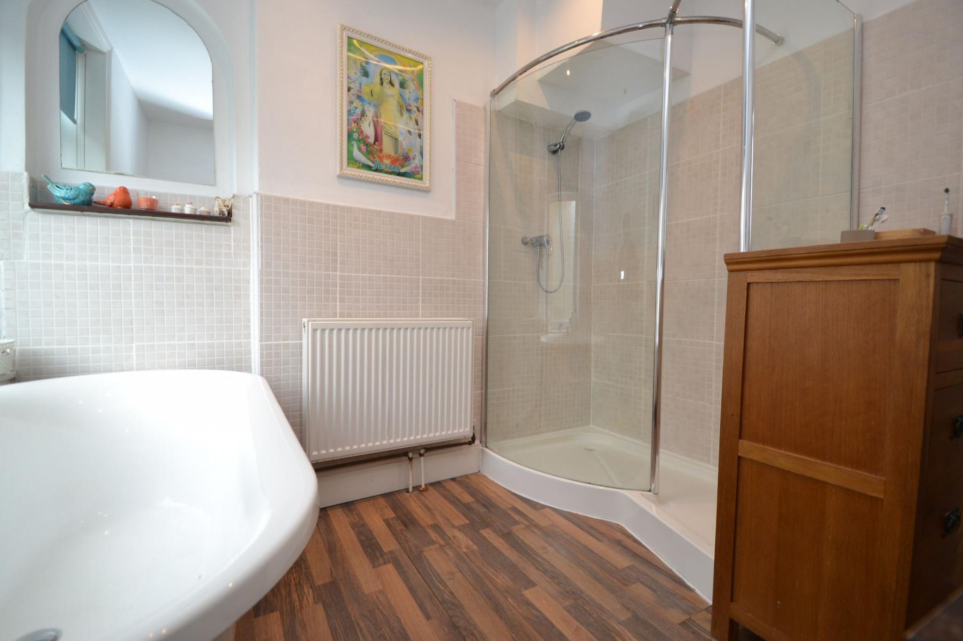 HOUSE BATHROOM: The house bathroom is a very impressive, modern, white four-piece suite comprising large walk in shower with a chrome thermostatically controlled shower unit, hand basin set on a vanity unit, toilet and a roll top bath with a chrome mixer tap, mosaic tiling to the walls, electric shaving point, radiator, wall heater.