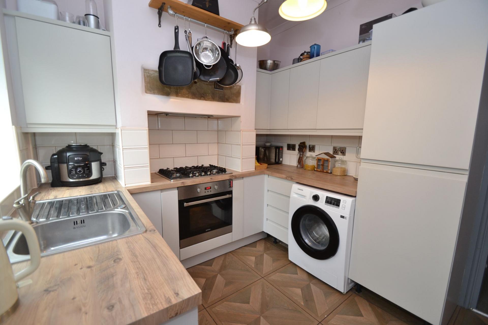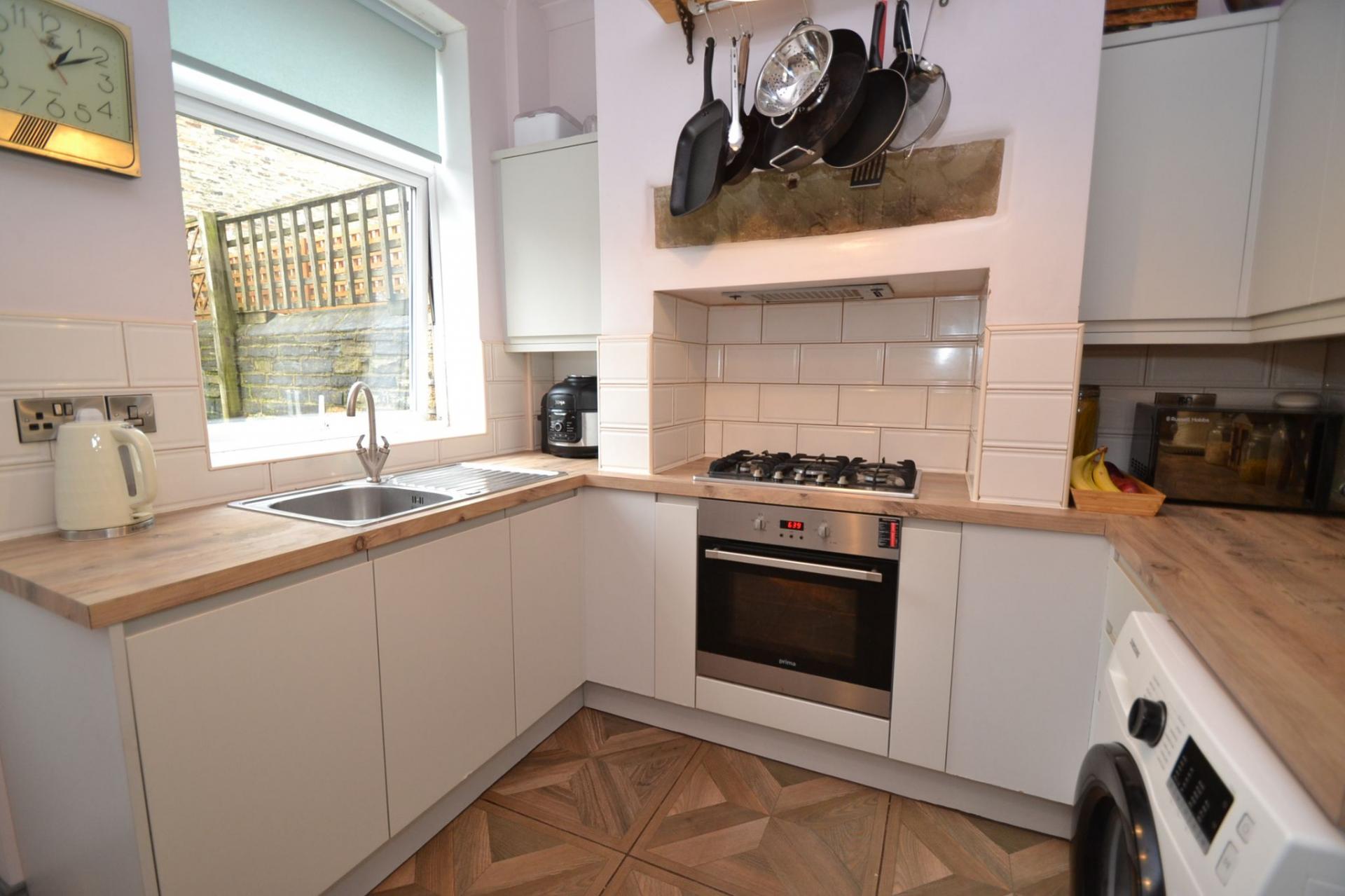 KITCHEN: 10’1’ x 8’9’ (3.07m x 2.67m). To the rear of the ground floor is the beautifully designed, replacement fitted modern kitchen which has wood effect work tops and tiling above. There are integrated appliances with a dishwasher and fridge freezer, plumbed for an auto-washer, stainless steel 5 ring gas hob, built in electric stainless steel oven, stainless steel sink with a mixer tap, Upvc dg window and door to the rear, tiled floor in wood effect, upright contemporary anthracite radiator.