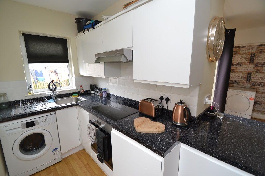 Dining Kitchen: 5.02m x 3.46m (16'5 x 11'4). Upvc dg French doors to rear, laminate floor, ch radiator, picture rail, fireplace surround with marble back & hearth along with an electric coal fire, under stairs cupboard housing the combi-boiler. In the kitchen area are a range of wall & base units in gloss white with sparkly work tops and matching splash backs plus white brick effect tiling, extractor hood over a 4 ring induction hob, built in electric cooker, space for a tall boy fridge freezer, Upvc dg window to rear, plumbed for an auto-washer, stainless steel sink with a mixer tap, side Upvc door.