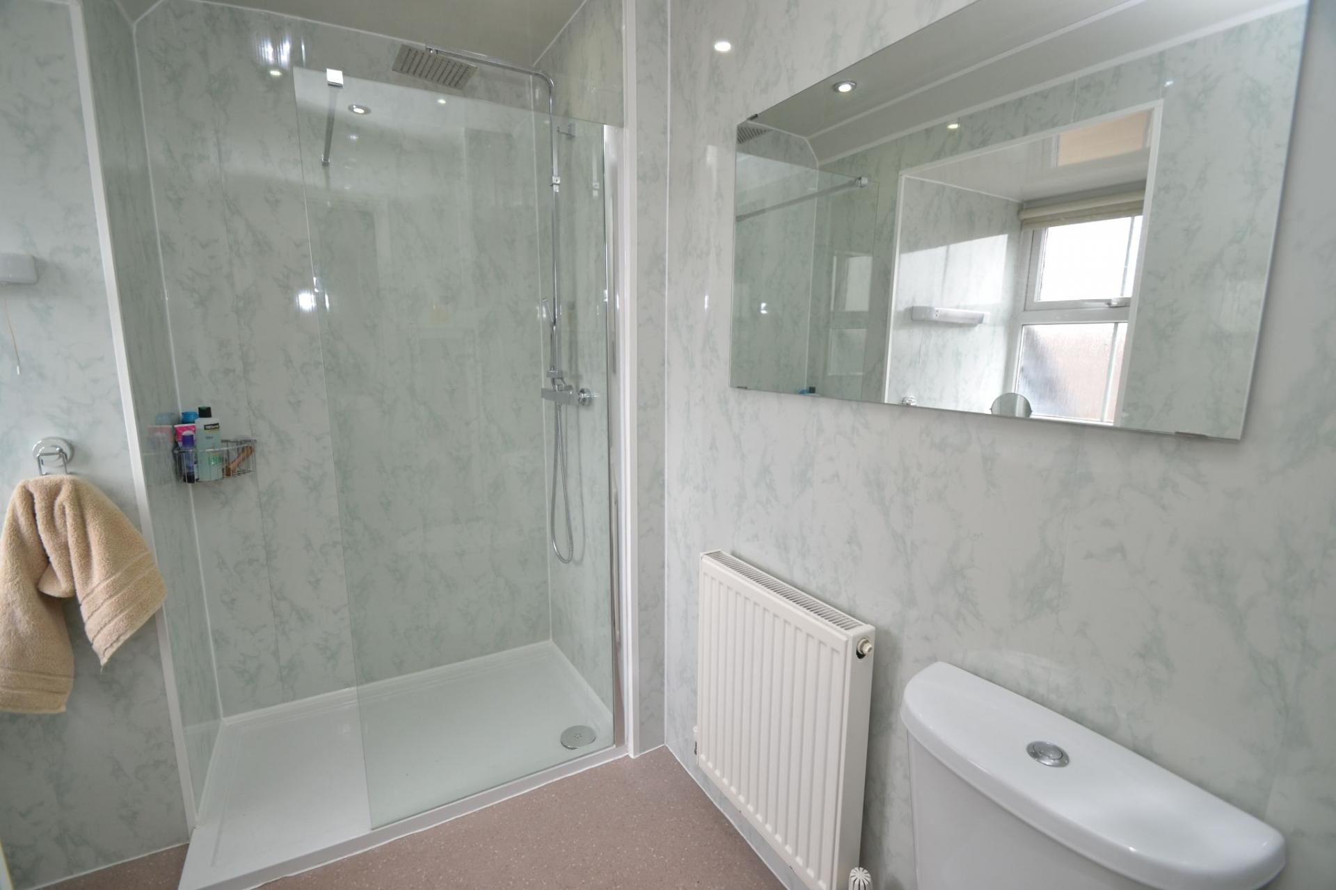 Family Bathroom: Three piece corner suite, glass screen with a thermostatically controlled shower unit, part tiled, inset ceiling lights and extractor, frosted Upvc dg window, electric shaving point, heated towel rail.