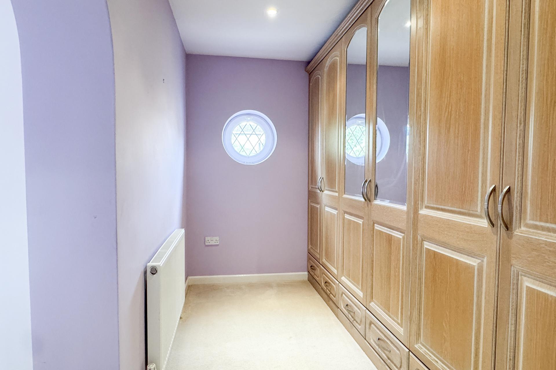 The front door opens into a central hallway, with the first bedroom on the left, overlooking the front garden. The main bedroom also faces the front and benefits from fitted cupboards, an extended dressing room, and a spacious en-suite shower room with a large walk-in shower and white suite. A further family bathroom with bath, basin, and WC is located along the hall.