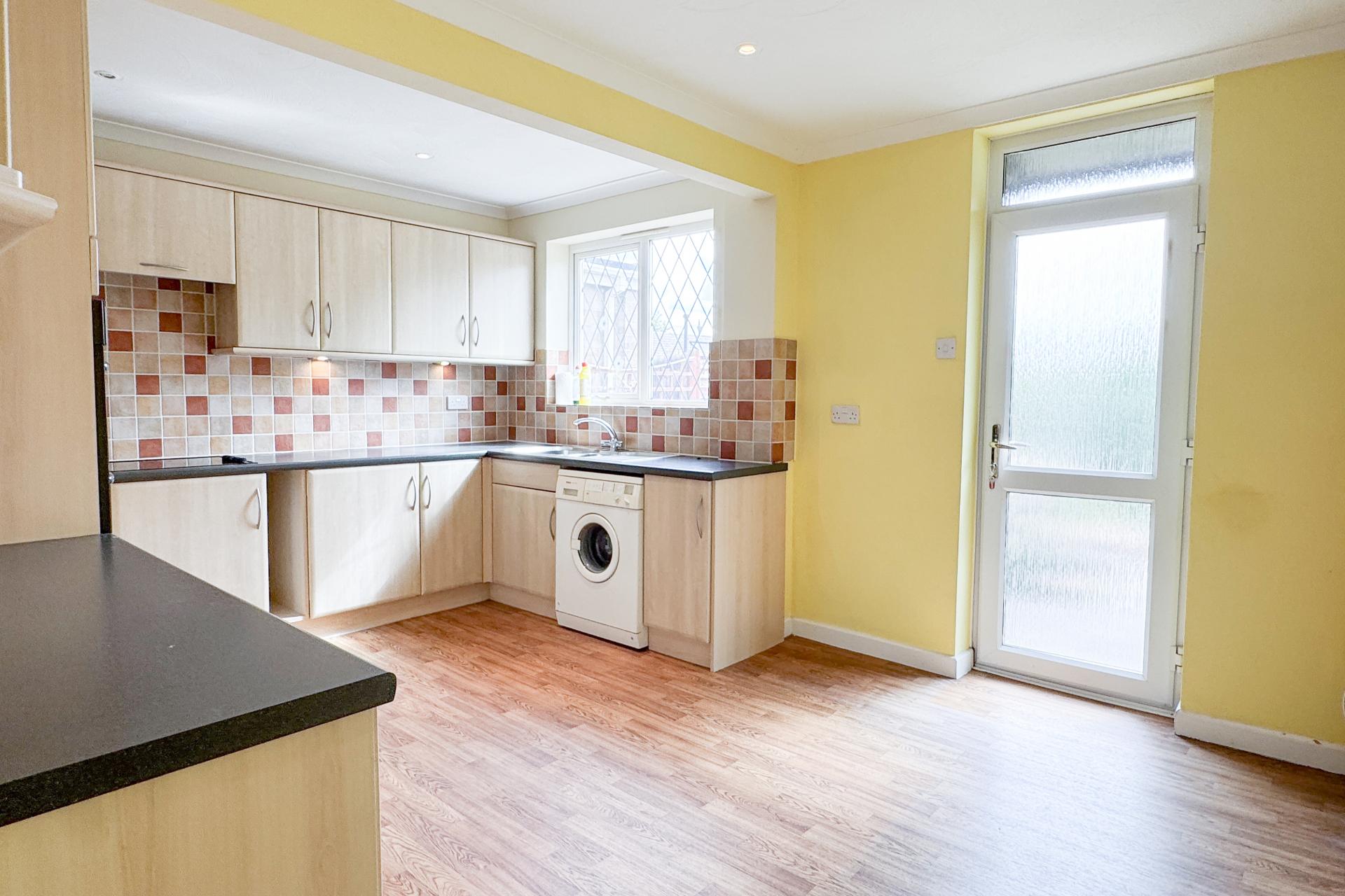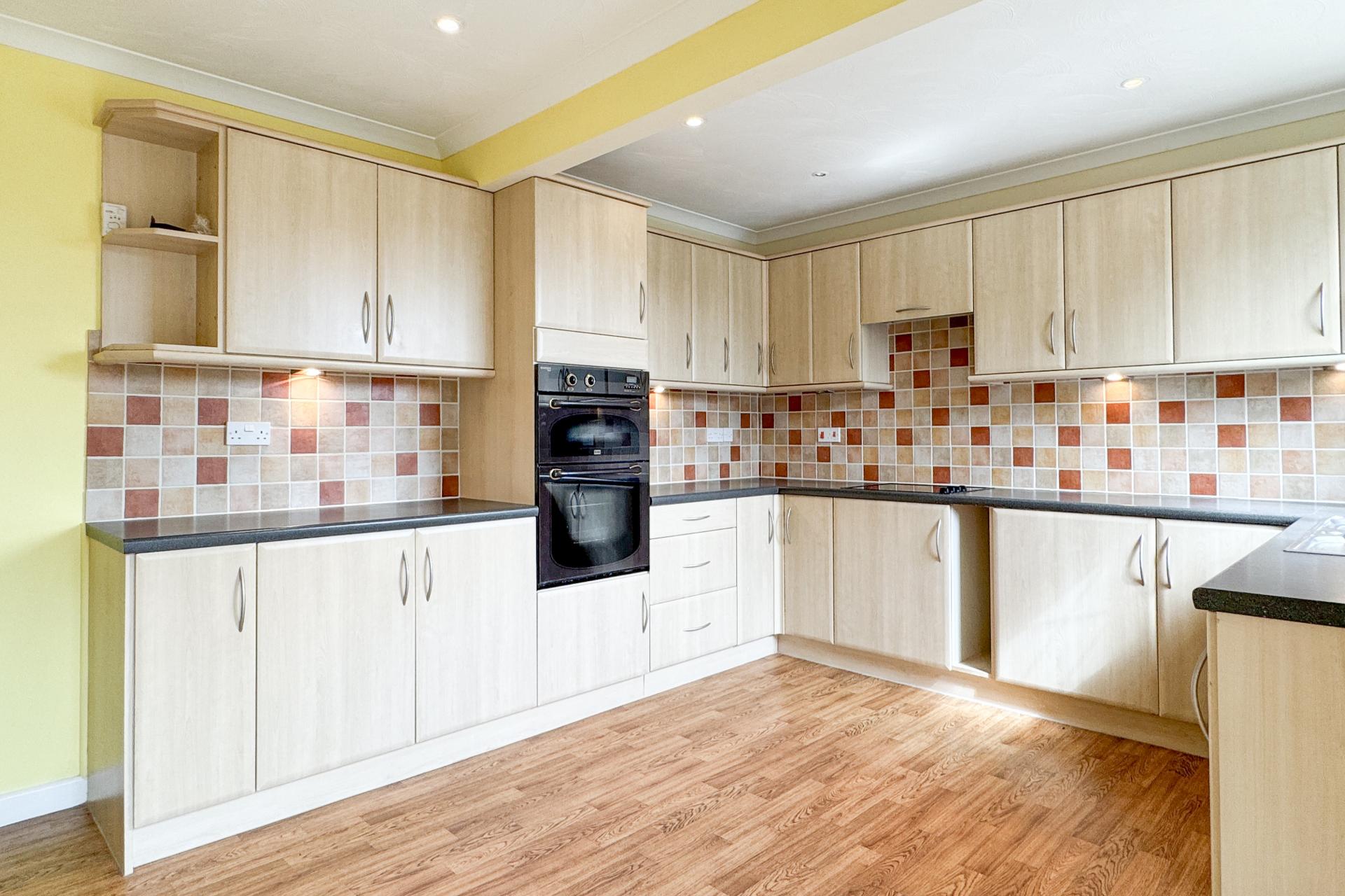 The sitting room is generously proportioned and features sliding doors leading into a bright sunroom, which in turn provides access to the garage and rear garden. The kitchen is fitted with a range of floor and wall cupboards, an integrated oven, and space for appliances, with a window looking out over the garden.