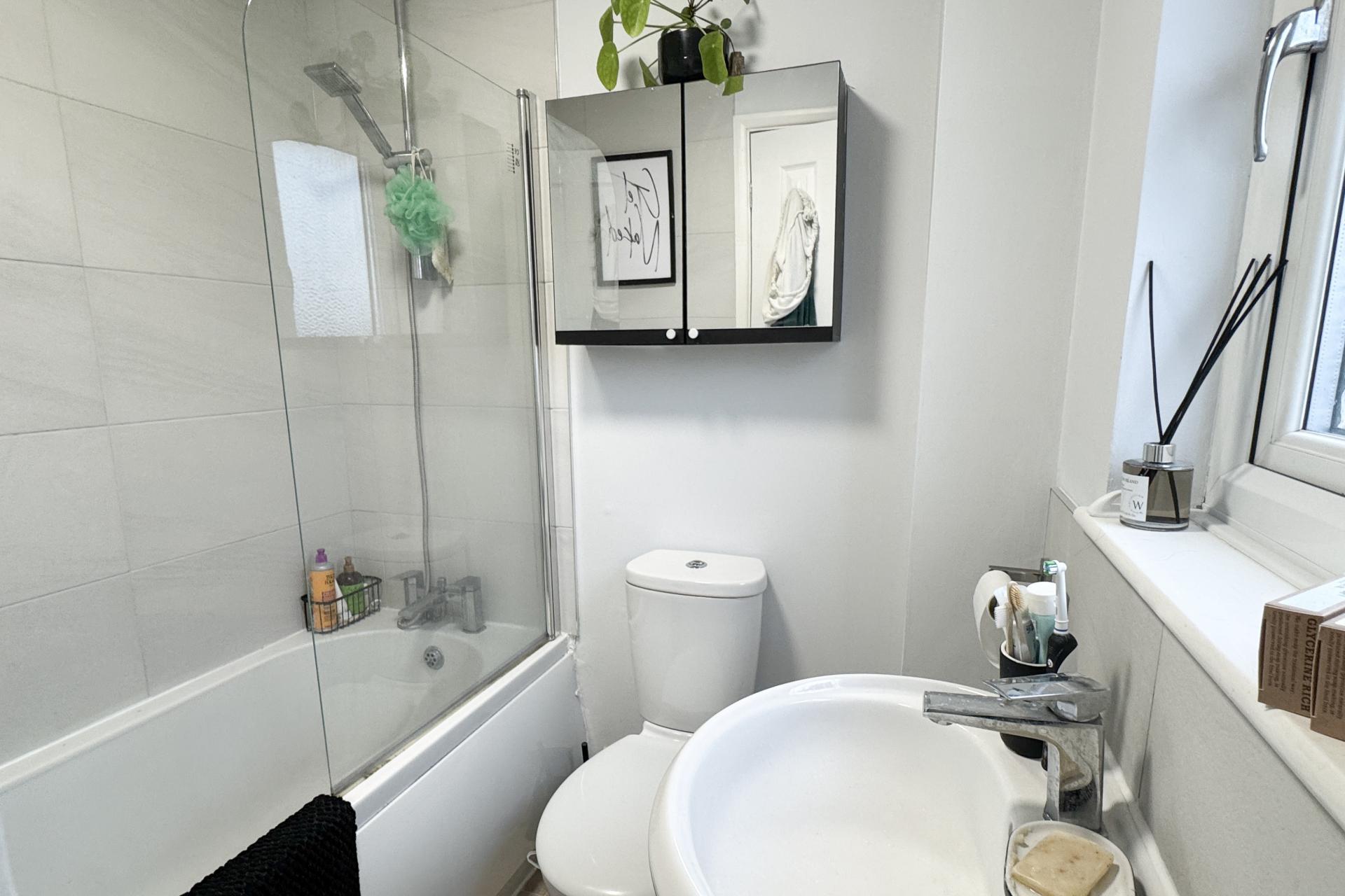Upstairs, the spacious main bedroom benefits from excellent natural light and includes built-in storage. The bathroom features a white suite with a power shower over the bath.