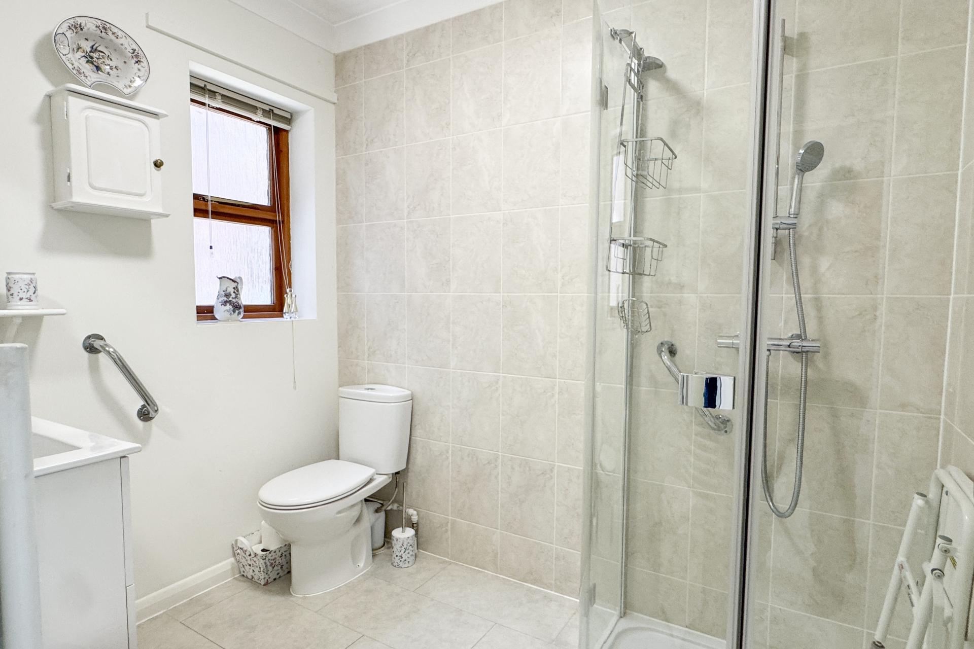 A particular highlight is the generous brick and uPVC double-glazed conservatory, providing an additional reception area with dual access to the gardens. There are two bedrooms, the principal with fitted wardrobes, and the second currently arranged as a home office with built-in cabinetry and double doors into the conservatory. The modern spacious shower room features a large walk-in enclosure with seat, WC, and vanity unit.