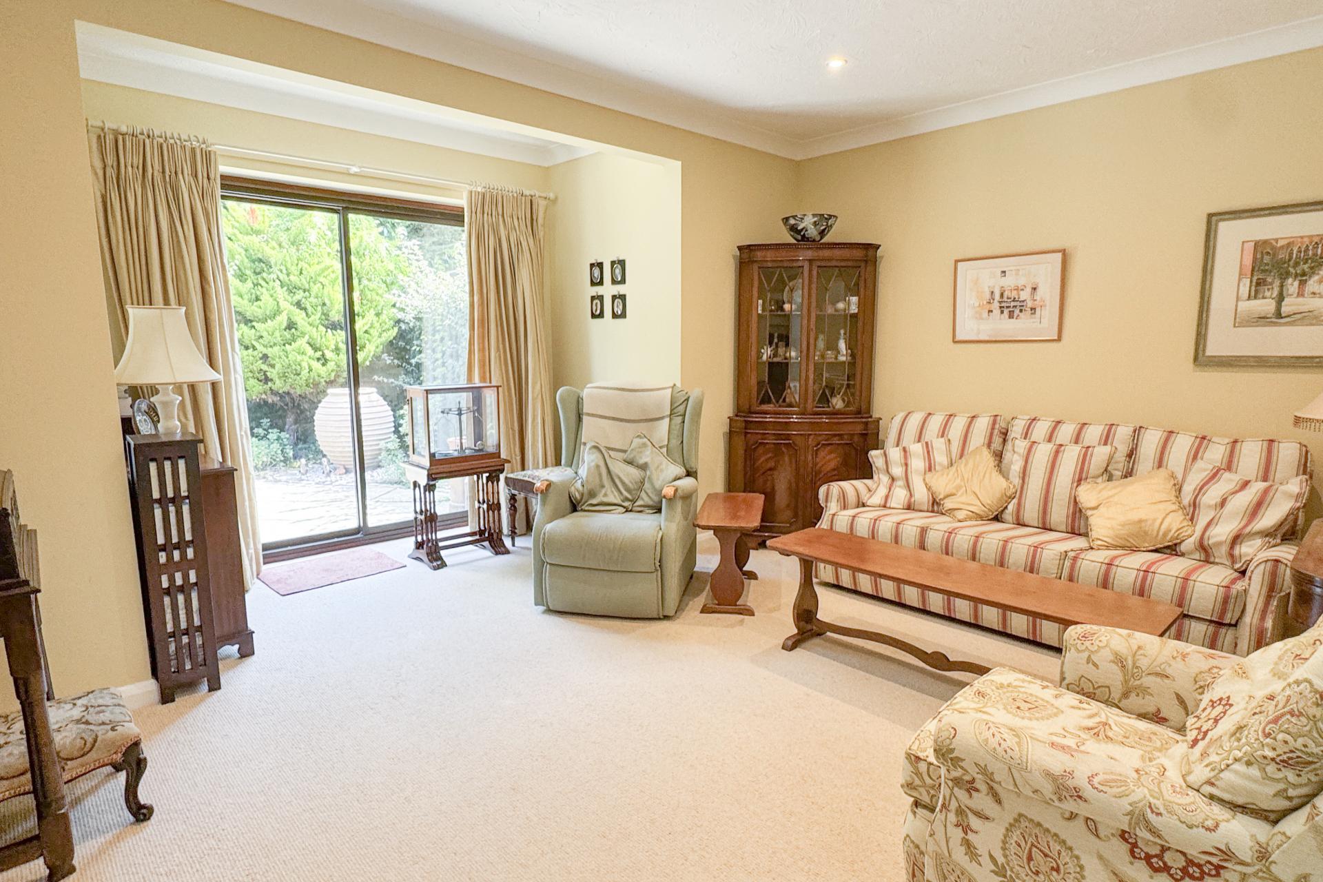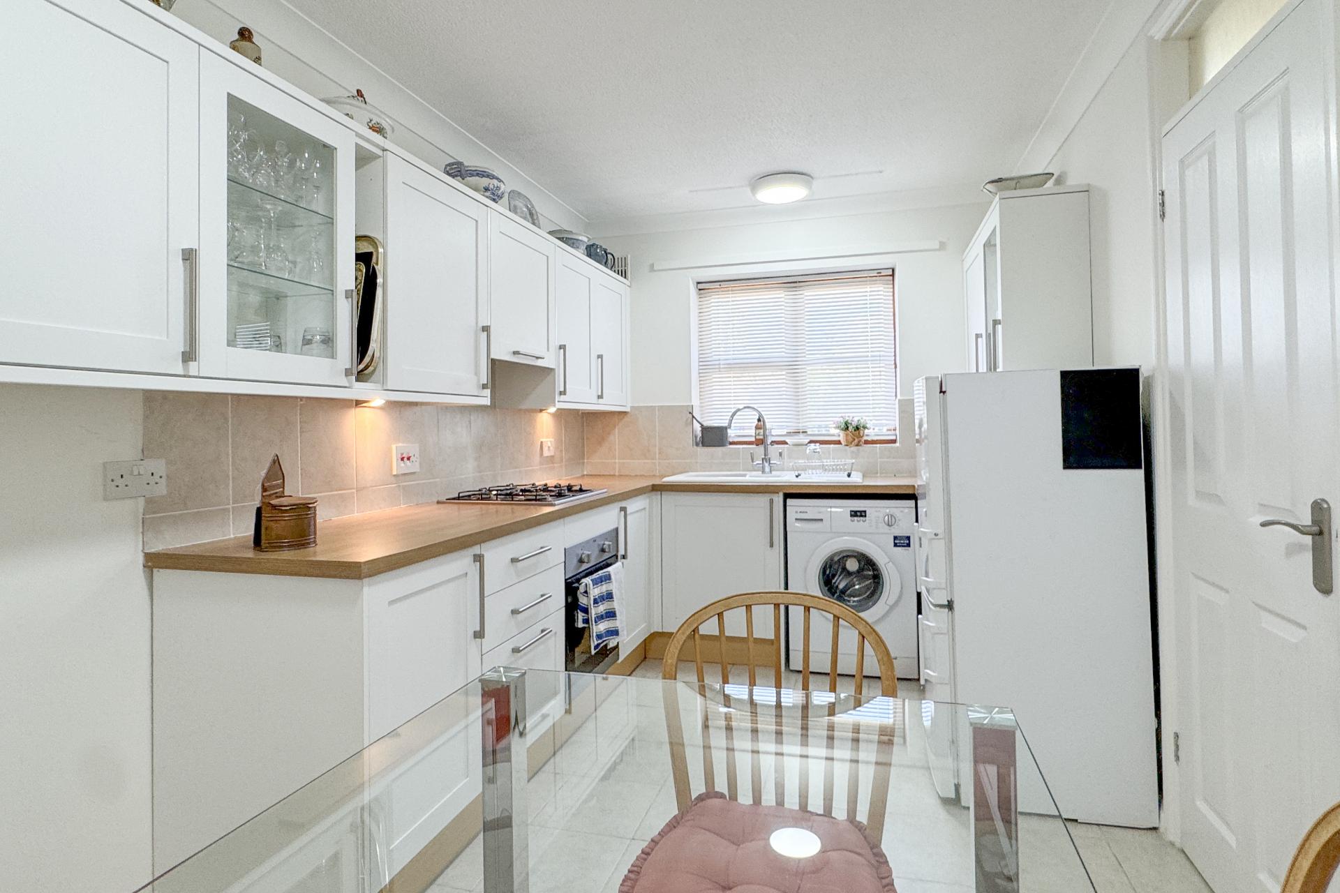 This particular home has been carefully maintained and tastefully improved in recent years. A welcoming entrance hall leads to a bright, spacious sitting room featuring an electric fireplace and glazed sliding doors opening onto the garden. The recently refitted kitchen is arranged in a classic Shaker style, with a good range of base and wall units, integrated oven, hob, extractor, and space for a breakfast table.
