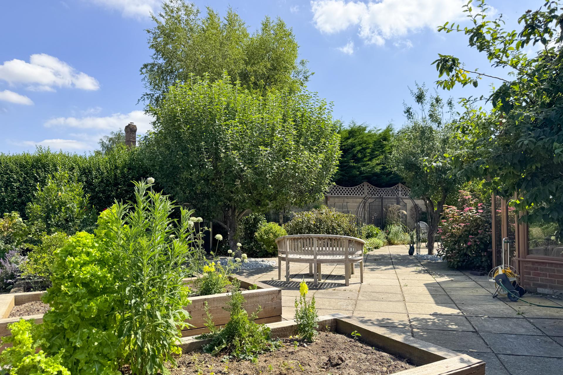 Outside, the property enjoys an enclosed, wrap-around garden, beautifully landscaped for low maintenance with patio areas, raised beds, specimen planting, and a potting shed. A storm porch shelters the front door, and a secure external store provides useful space for tools and equipment. The single garage is located nearby in a block of four.