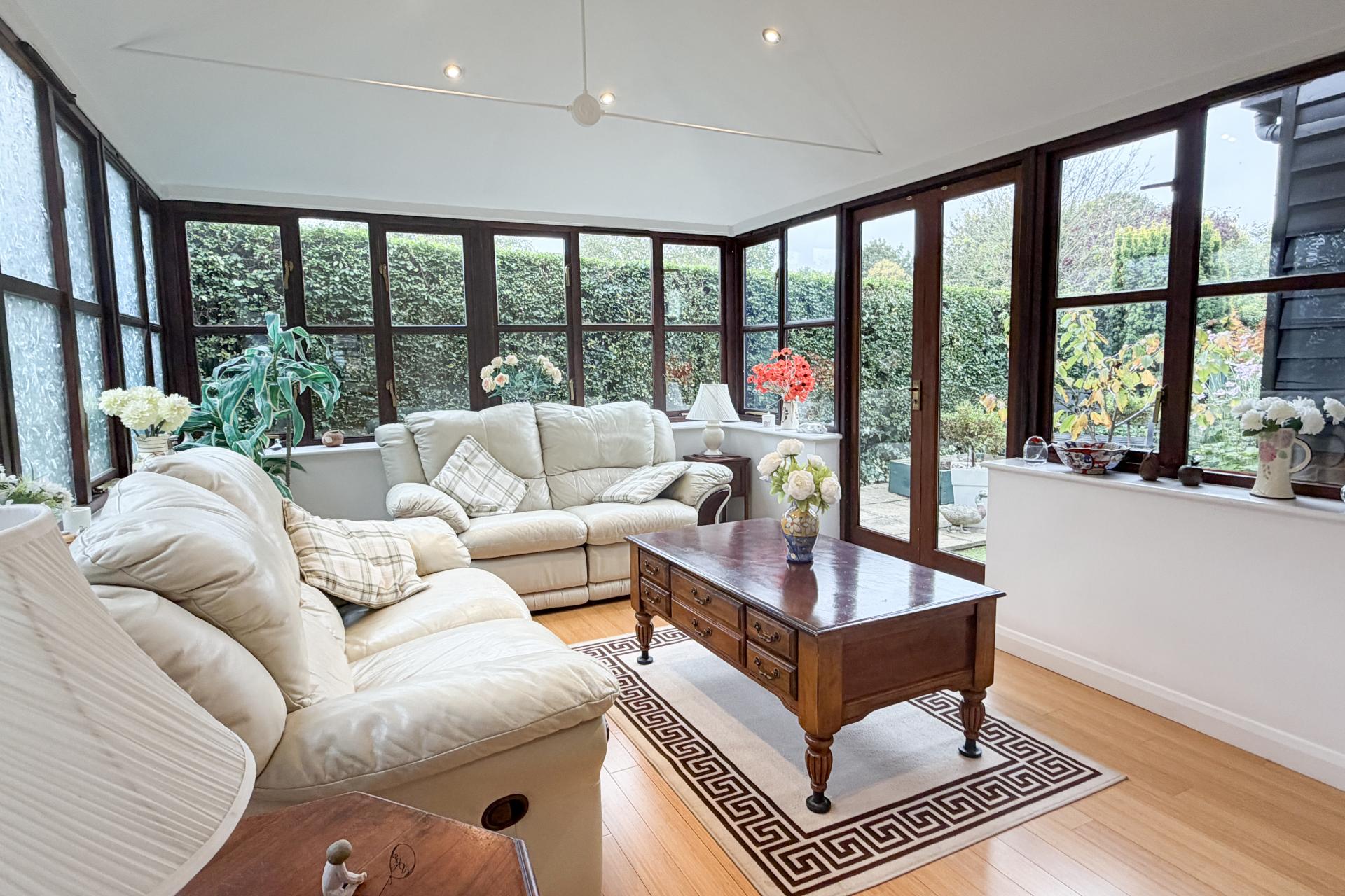 The property has been tastefully improved and carefully maintained. The welcoming entrance hall leads to a bright sitting room with an electric fireplace and French doors opening to the garden. To the left-hand side, the kitchen features white gloss soft-close cupboards, solid wood flooring, an induction hob and space for a fridge-freezer. An archway opens to a dining area and a light-filled conservatory which can be used all year round due to insulation, tiled roof, and heating. The ground floor also includes a cloakroom with WC and basin, and a utility room with fitted cupboards, additional sink, and space for appliances. A lift provides easy access to the first floor if required.