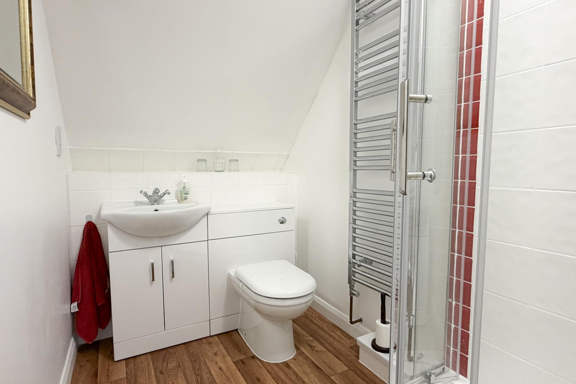 Upstairs, the master bedroom enjoys dual aspects, fitted wardrobes, and lift access. The landing is currently used as a small study area. The second bedroom, positioned to the rear, has fitted cupboards and an en-suite shower room with WC, vanity sink, and heated towel rail. A further family bathroom includes a power shower, WC, and wash basin.