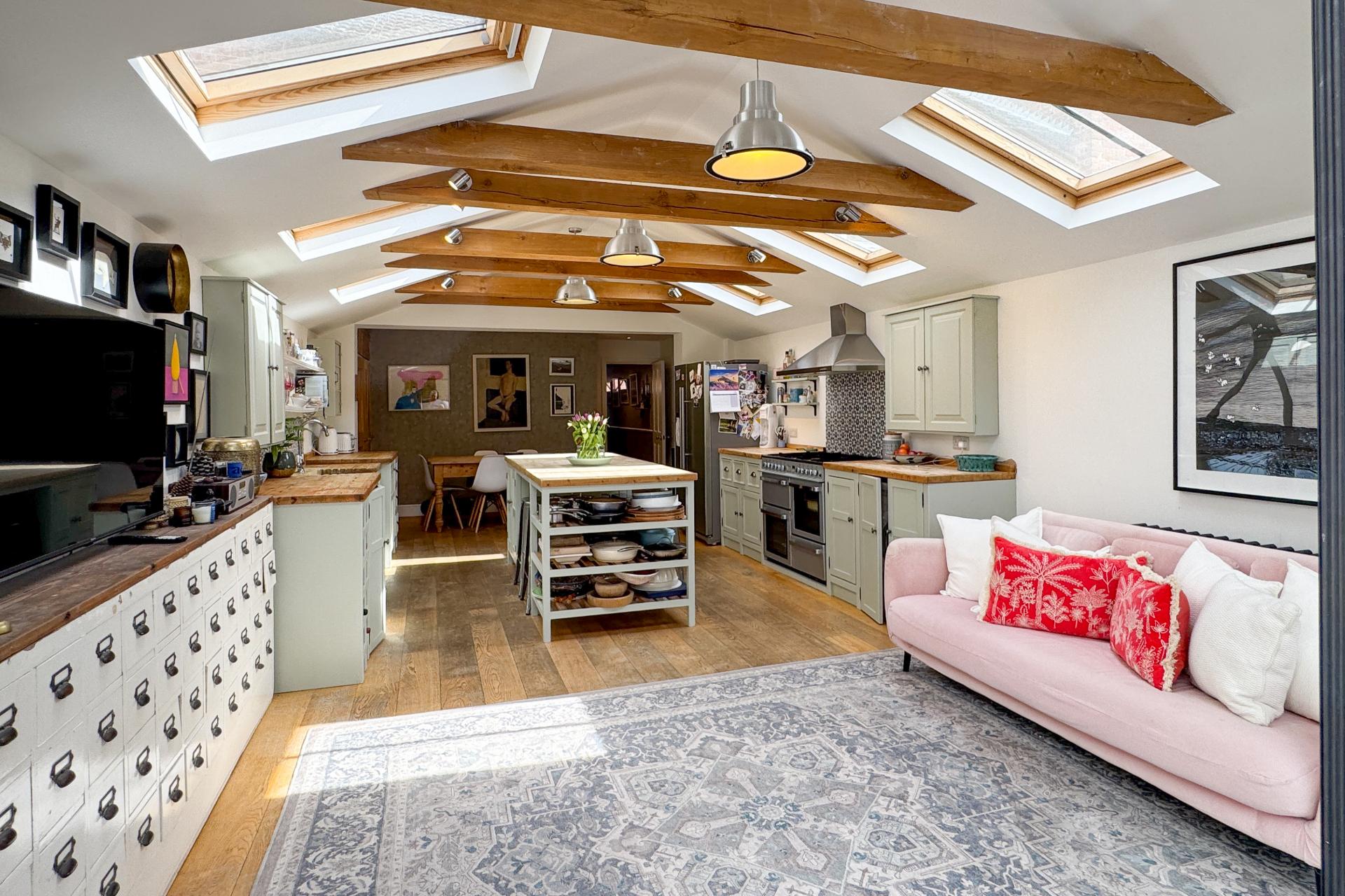 At the heart of the home is the stunning kitchen and dining room—an impressive open-plan space ideal for family life and entertaining. The bespoke sage green kitchen units are complemented by solid wooden worktops and exposed beams. A large pine larder, integrated dishwasher, wine rack, and focal 8-point gas oven add both charm and functionality. There’s also ample space for an American-style fridge freezer. Bifold doors open onto a decked patio, creating seamless indoor-outdoor living and making this space the true hub of the home. The living room features built-in cupboards and shelving, centred around a striking feature fireplace, creating a warm and welcoming atmosphere. This floor is complete with a handy cloakroom with WC and basin.