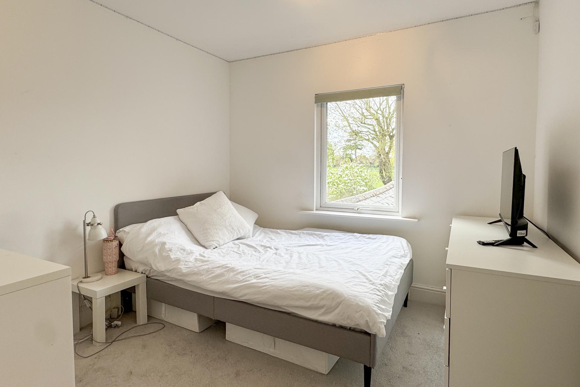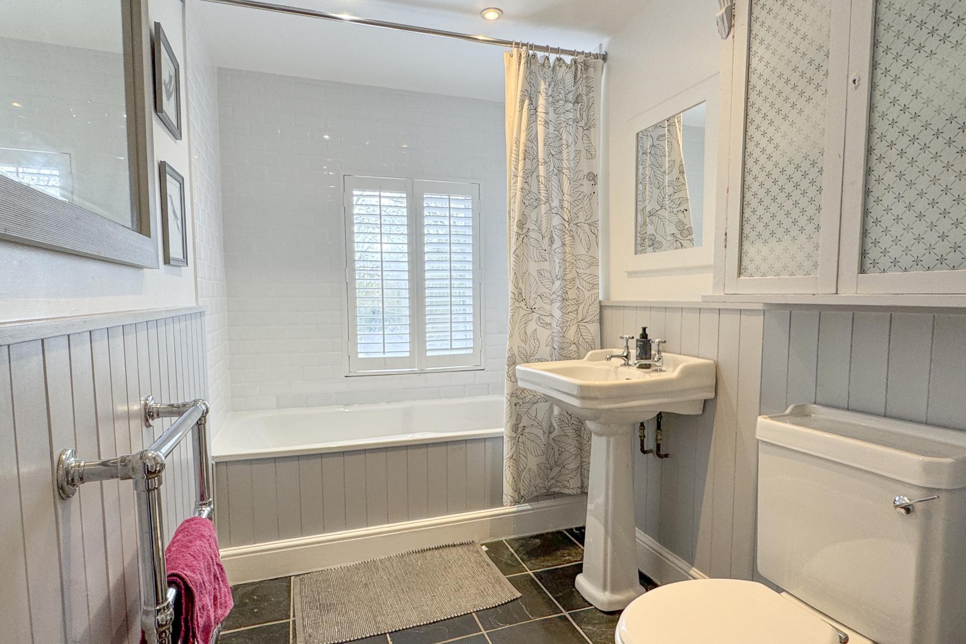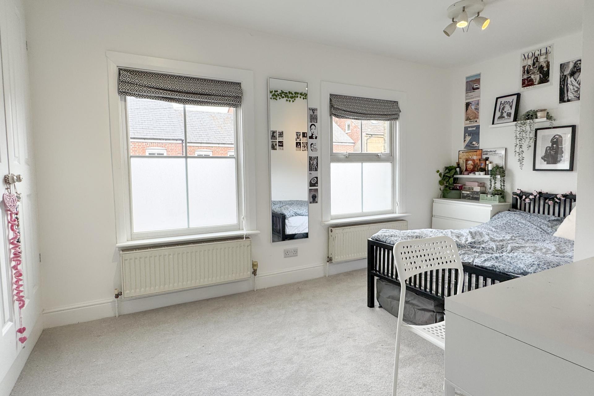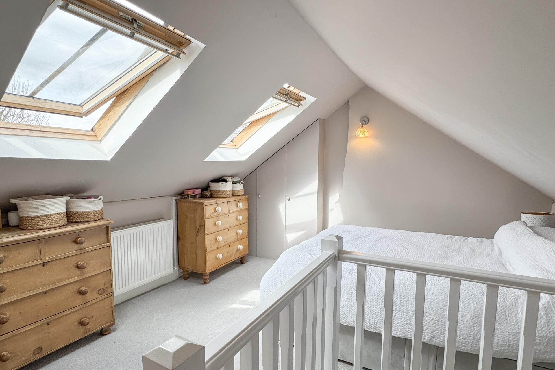 On the first floor, you’ll find two well-proportioned bedrooms. The rear bedroom boasts beautiful views over the park, while the front-facing bedroom features a built-in wardrobe and neutral décor. A stylish family bathroom completes this level, with grey panelled walls, slate flooring, white fittings, and chrome accents, including a bath with a shower. The second staircase leads to a bright third bedroom on the top floor. With Velux windows, neutral tones, and a built-in wardrobe.