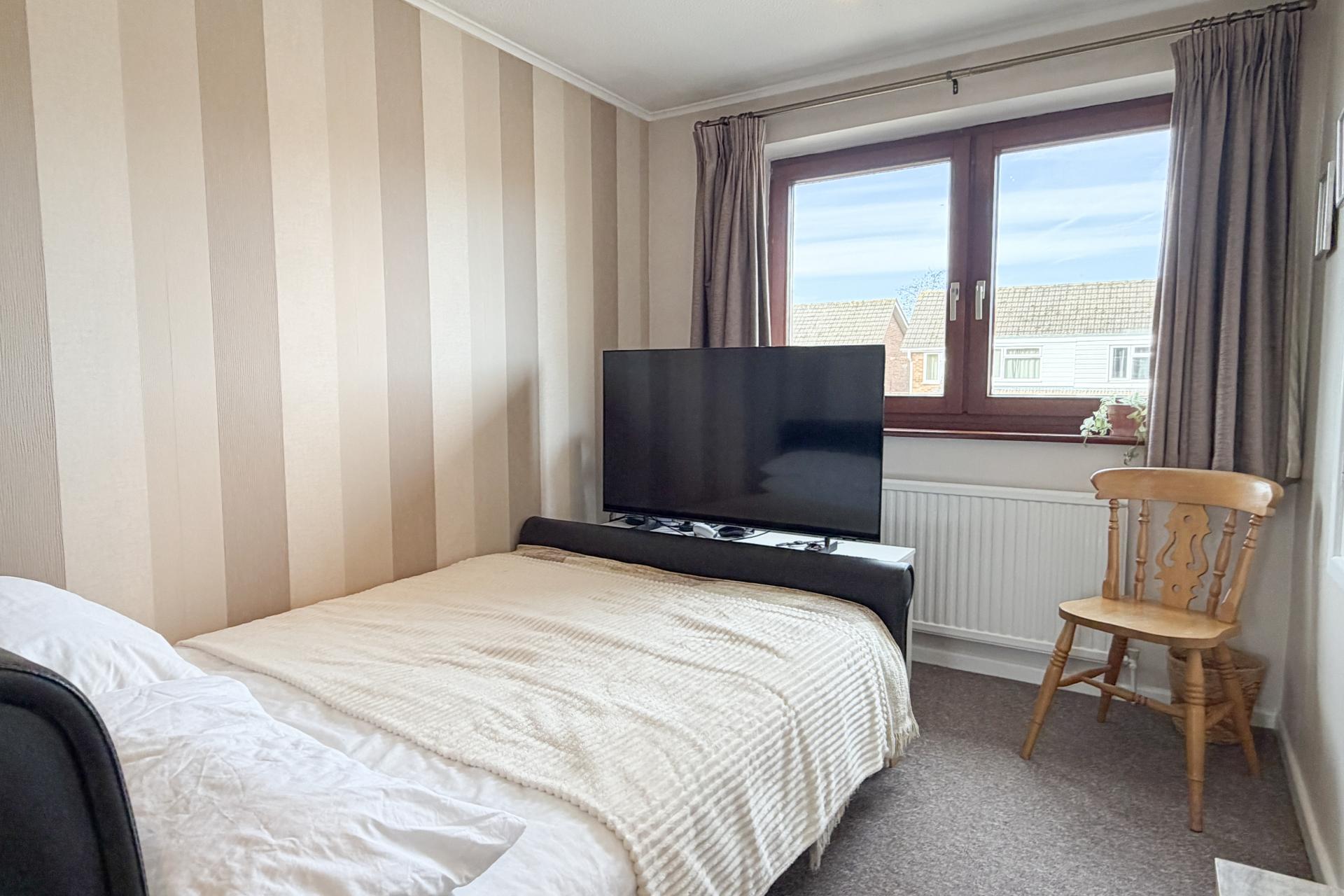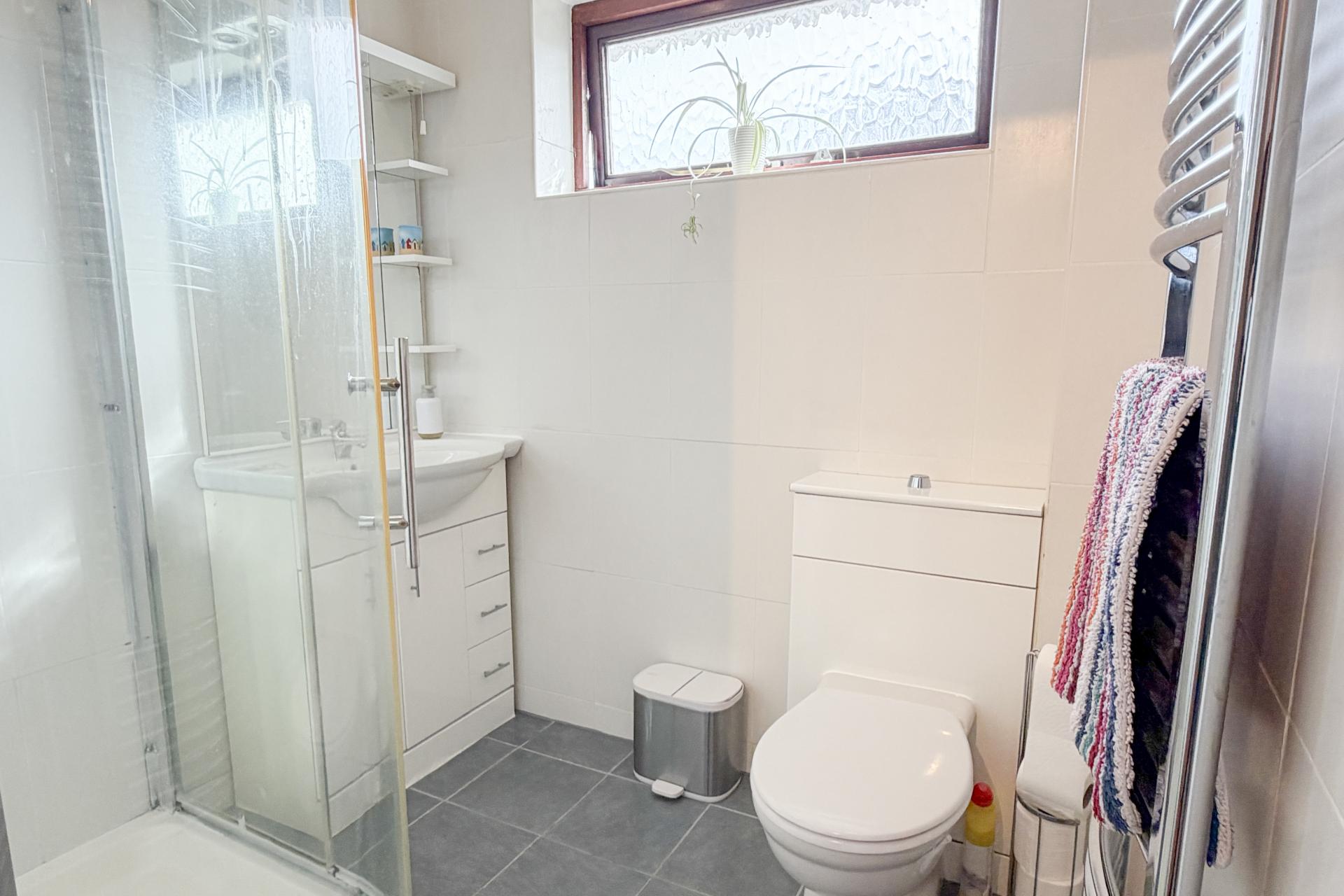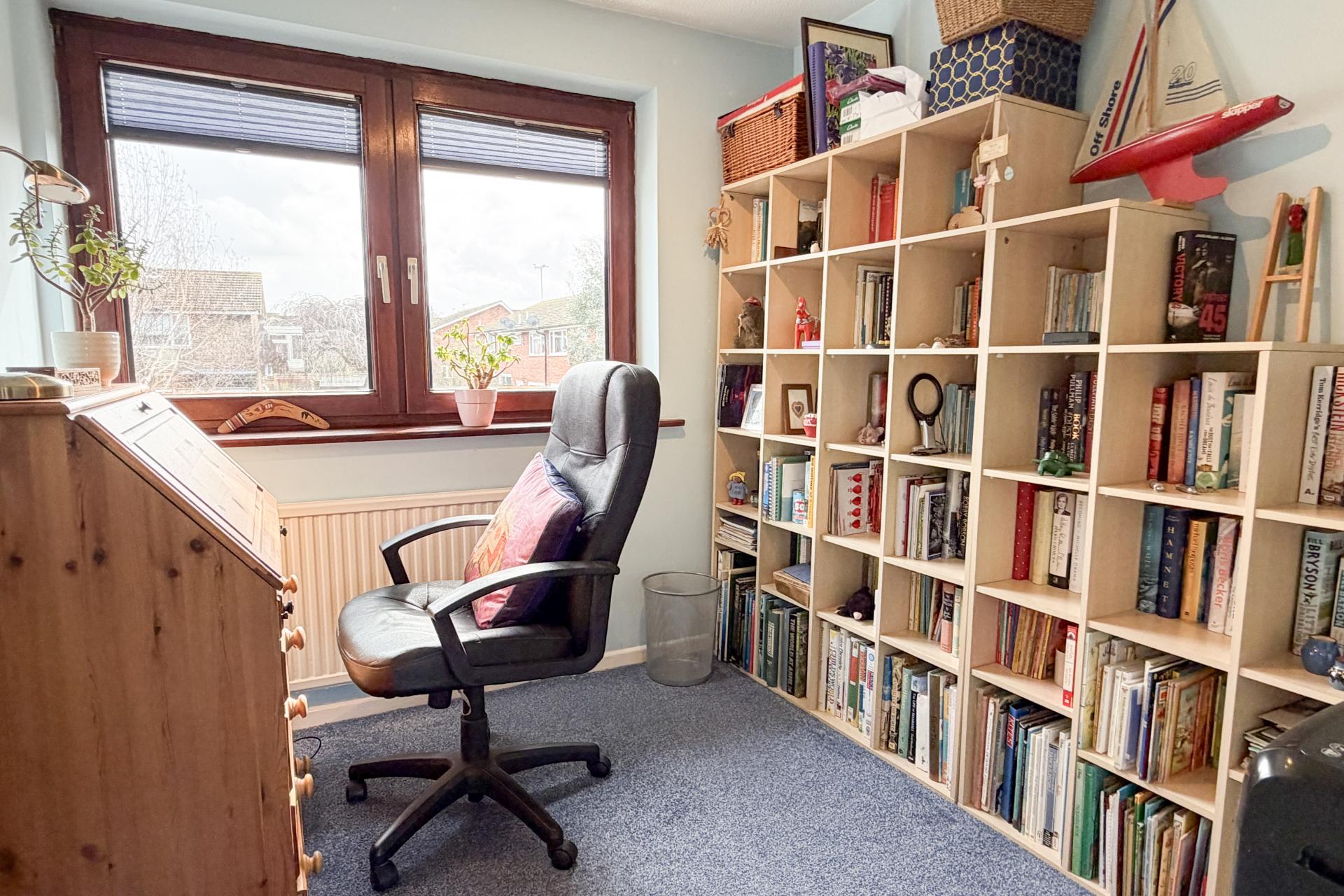 Upstairs, the first-floor landing provides access to the family bathroom, finished with full-height tiling and fitted with a corner shower, WC and vanity unit with wash basin. The principal bedroom is positioned at the front of the property and offers a spacious and light-filled retreat, complemented by a useful fitted cupboard. There are three further bedrooms, two of which overlook the rear garden, while another is currently arranged as a home office.