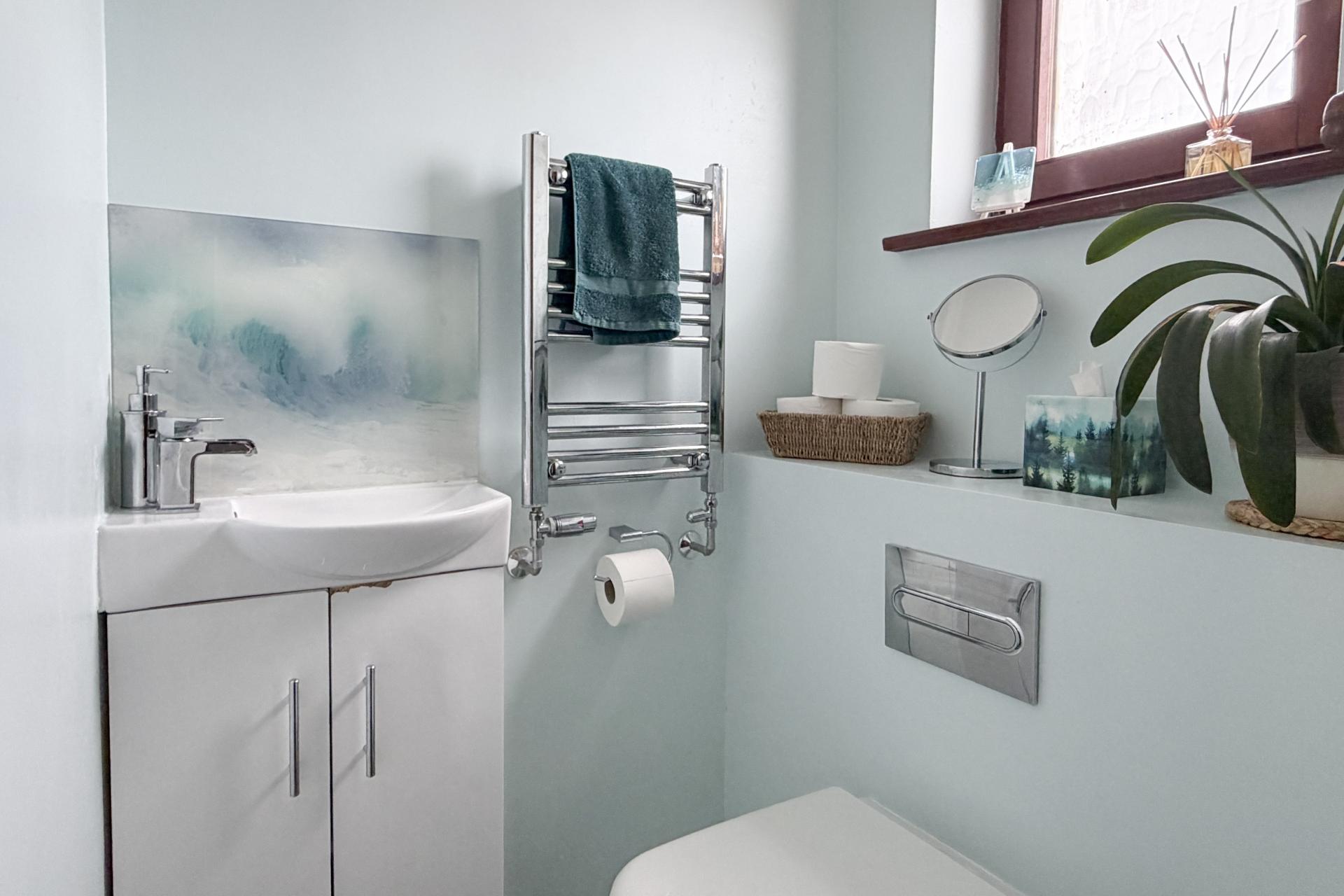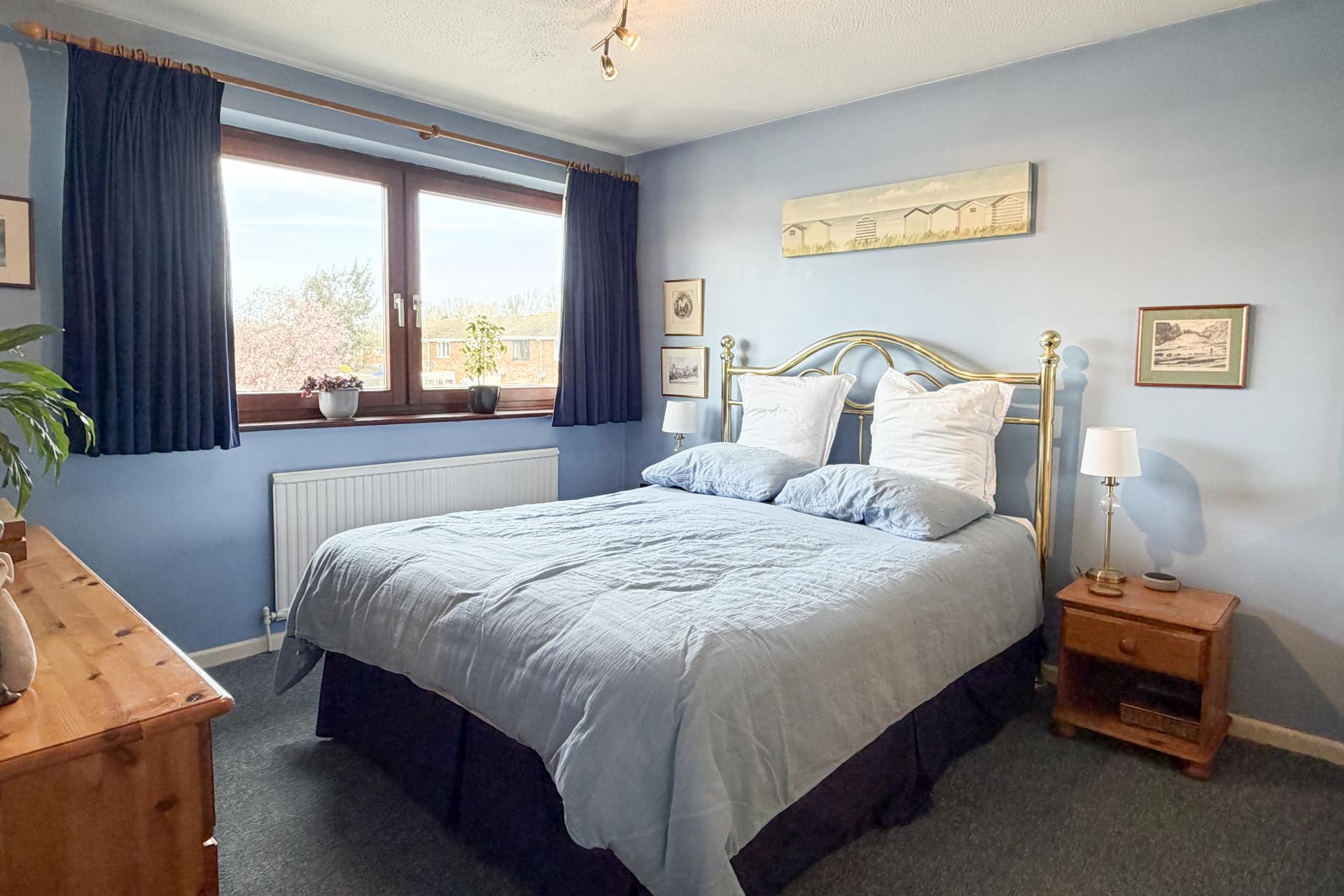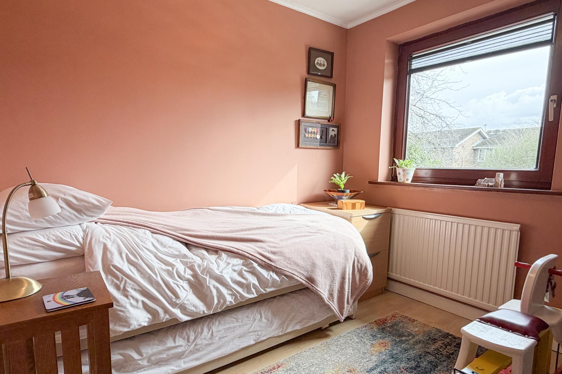 Upstairs, the first-floor landing provides access to the family bathroom, finished with full-height tiling and fitted with a corner shower, WC and vanity unit with wash basin. The principal bedroom is positioned at the front of the property and offers a spacious and light-filled retreat, complemented by a useful fitted cupboard. There are three further bedrooms, two of which overlook the rear garden, while another is currently arranged as a home office.