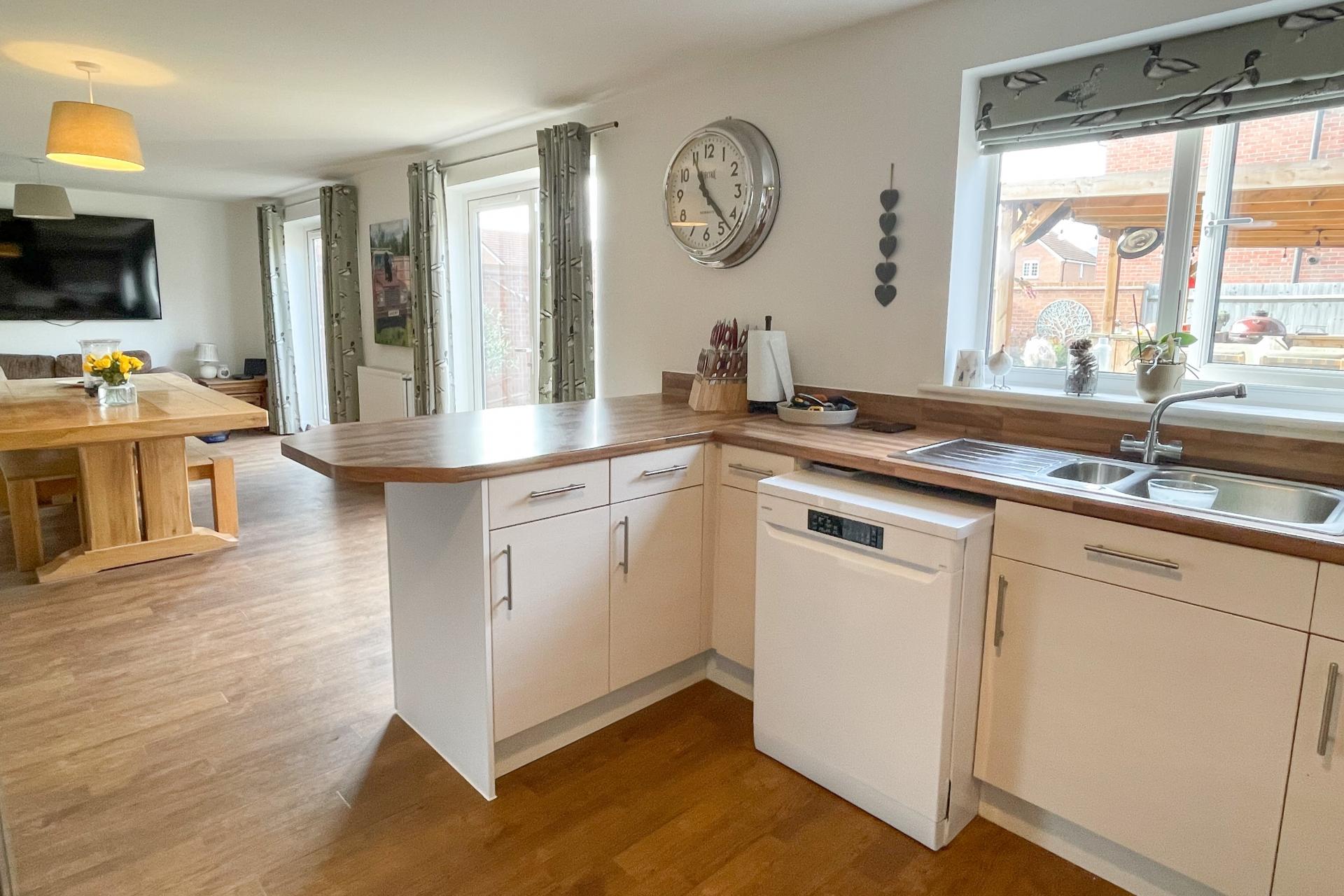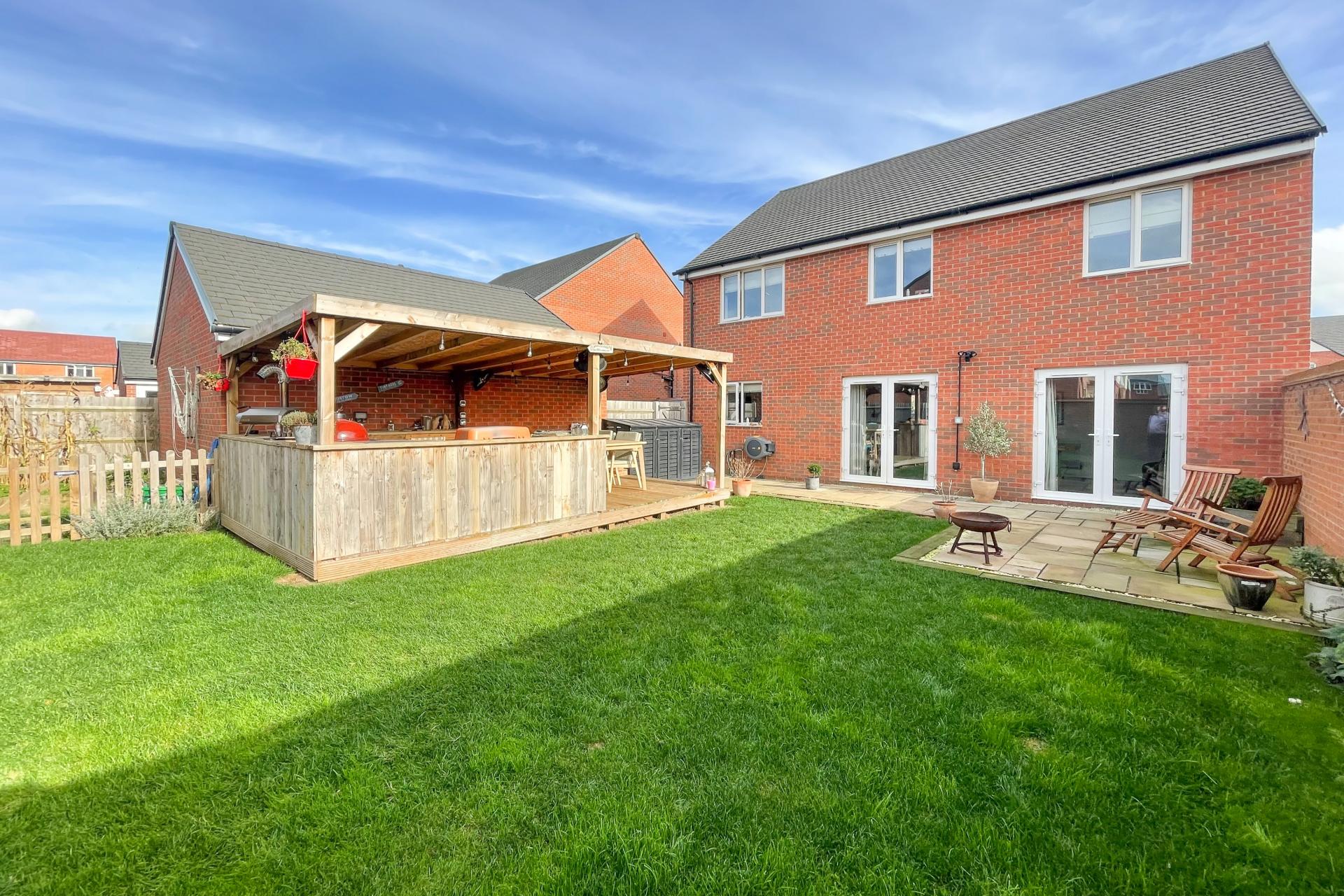 Robin Gibb Road is an impressive five bedroom detached residence, built to a high standard by Persimmon Homes in 2017. The light filled entrance hall, has access to the study which overlooks the front, on the left is a spacious sitting room. The hub of the house is the kitchen/family room, which is fitted with base and eye level units along with a breakfast bar with integral cooker and gas hob with room for an American style fridge freezer, laid on a vinyl flooring. The breakfast/family area is an ideal space to entertain and relax in, with two sets of patio doors which lead out to the back garden. A utility room leads off the kitchen with an external door to the side of the property. The first floor accommodation consists of; a master suite with built in closets and a large en-suite with bath and shower, three further double bedrooms, one benefiting from an ensuite, along with a single bedroom and a family bathroom with and walk in shower, all reached from a spacious light filled landing. Externally are front and rear gardens. The rear garden, mainly laid to lawn with an outside dining area, has colourful borders, providing plenty of places to sit and enjoy the sunshine and the tranquil surroundings. The carefully designed outdoor kitchen & dining area has been created for outside entertaining, complete with lighting, heaters, and space for barbeque, and pizza oven. The front garden has an established planting scheme, with a driveway with off street parking for six vehicles, a detached double garage with electric over door. The property has gas fired central heating to radiators throughout.