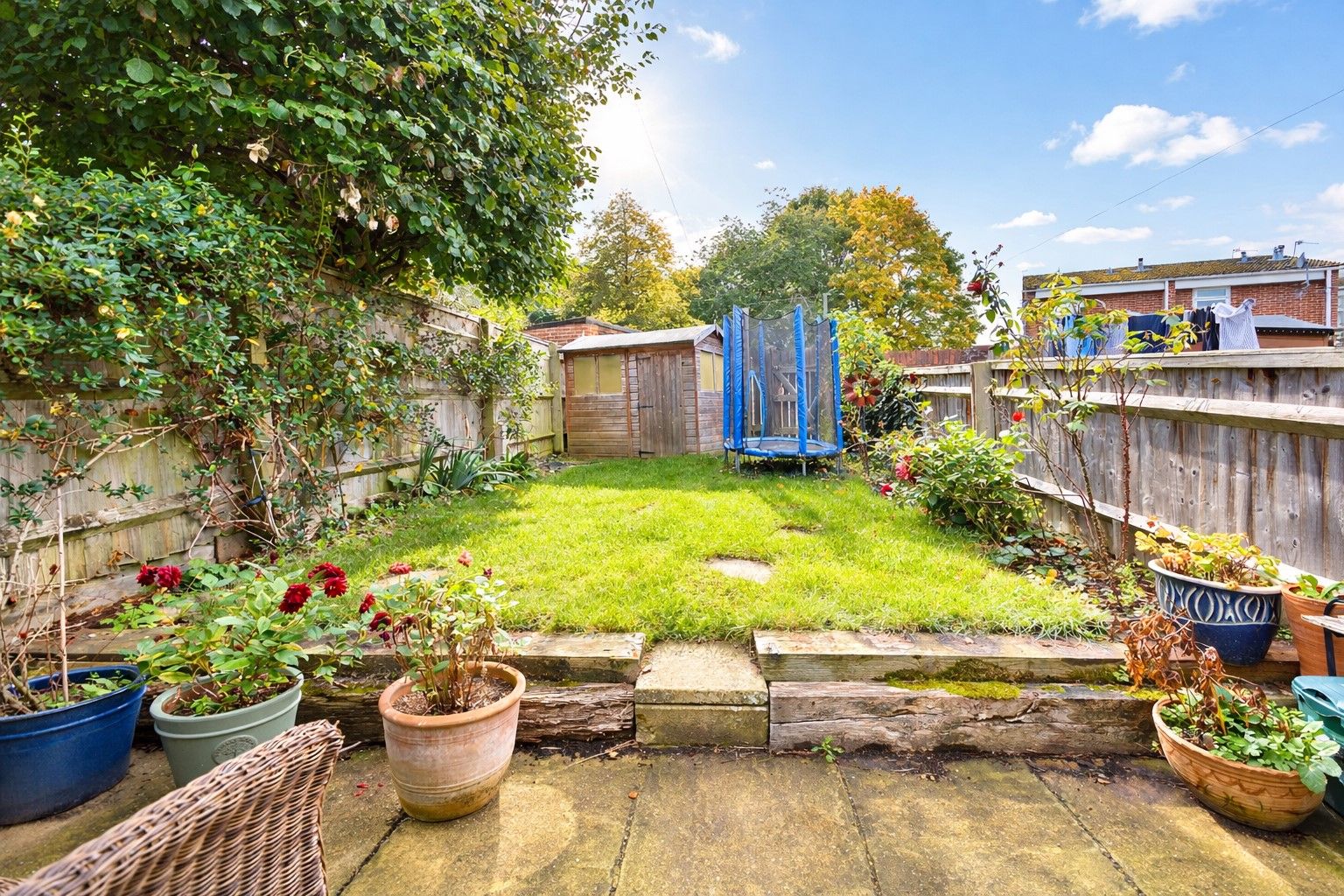 The ground floor features a generous 17ft open-plan living room, a modern, well-presented kitchen, and a conservatory at the rear opening onto a sunny garden with lawn and paved patio—perfect for outdoor entertaining.