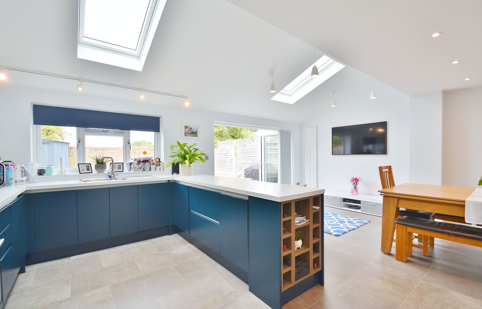 - Fabulous 20’ open-plan kitchen/dining/family room with skylights and bifold doors