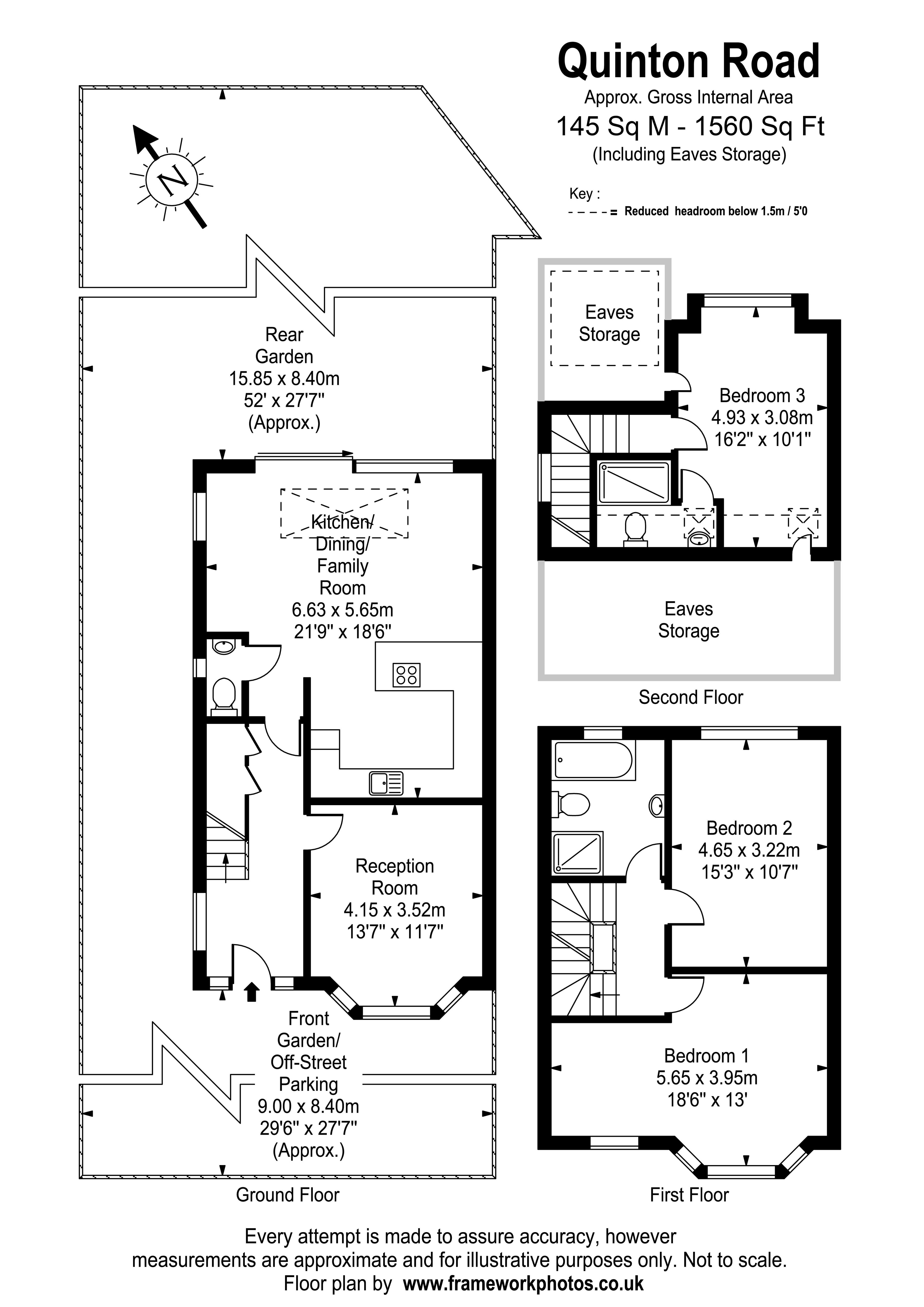 As illustrated in the floor plan provided, the accommodation is arranged over three floors (approx. 145 sqms / 1560 sqft). The ground floor comprises a good size entrance hall with under stairs utility cupboard, front reception with bay window, and a large open-plan kitchen / living / dining room with skylight window as well as large sliding doors to the garden. To complete the ground floor there is guest W.C.